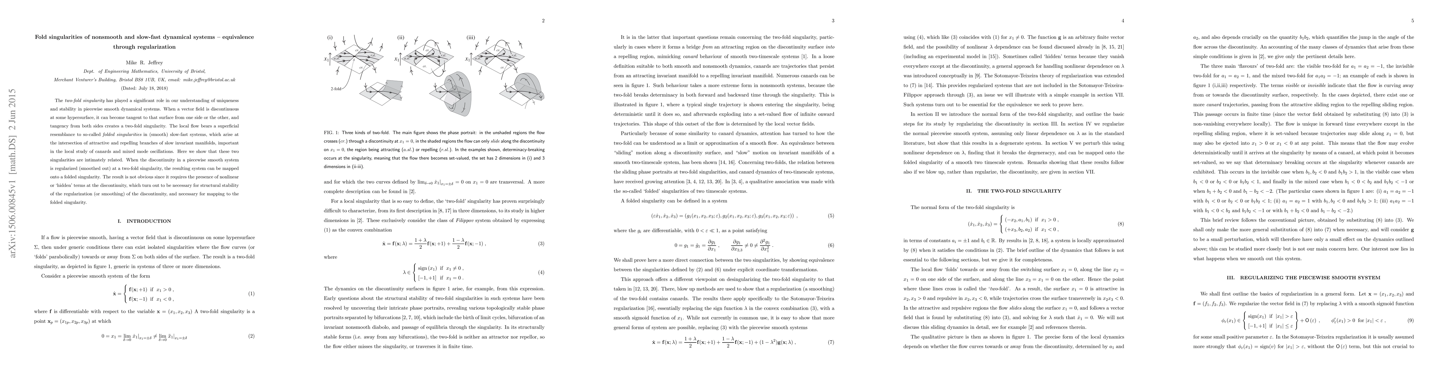 This paper explores the equivalence between two-fold singularities in piecewise smooth dynamical systems and folded singularities in smooth slow-fast systems through regularization. It demonstrates that smoothing out discontinuities in piecewise systems can map them onto folded singularities, highlighting the necessity of nonlinear terms for structural stability and the mapping process.