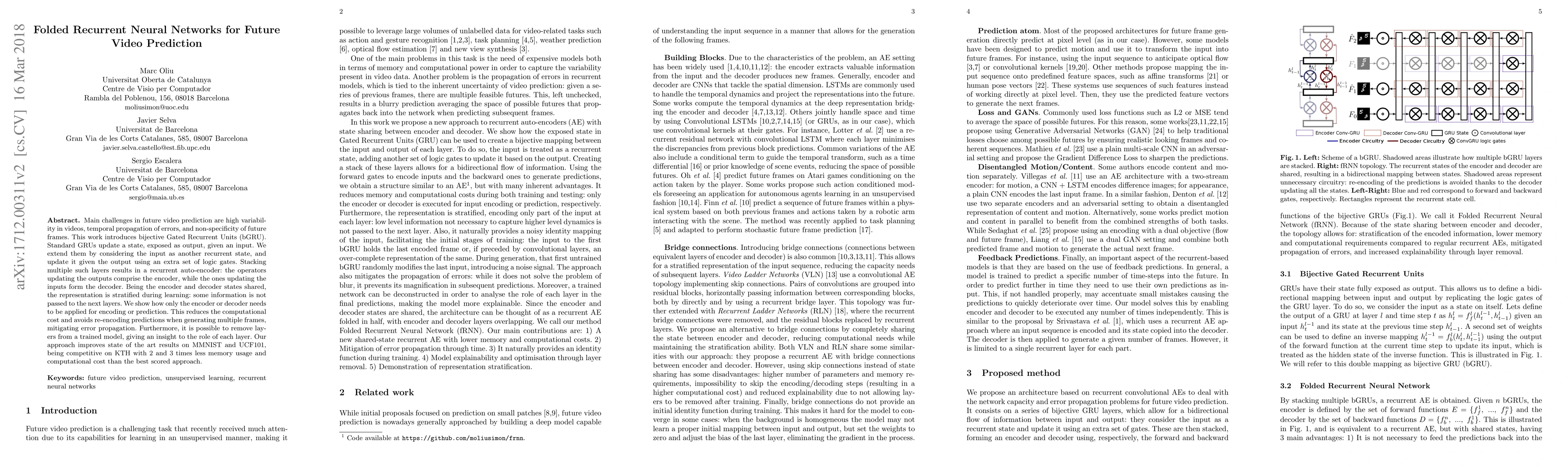 This paper introduces a novel approach to future video prediction using folded recurrent neural networks that reduce computational cost and improve explainability, outperforming state-of-the-art results on three video datasets.