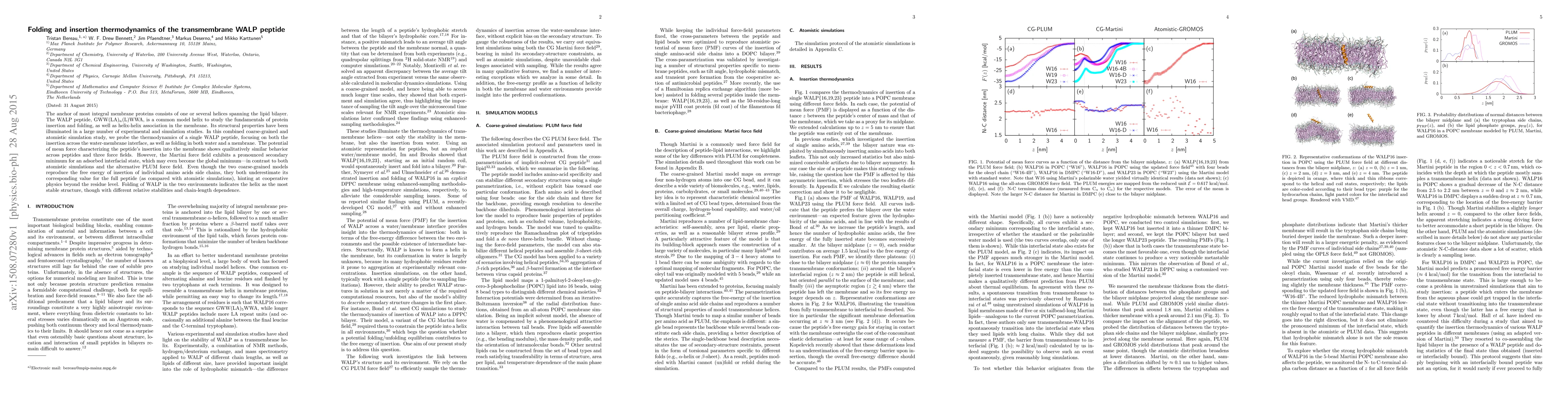 This study combines coarse-grained and atomistic simulations to investigate the thermodynamics of the WALP peptide's insertion into and folding within a membrane. The simulations reveal that while both coarse-grained models capture individual amino acid side chain insertions, they underestimate the full peptide's insertion free energy, suggesting cooperative effects.