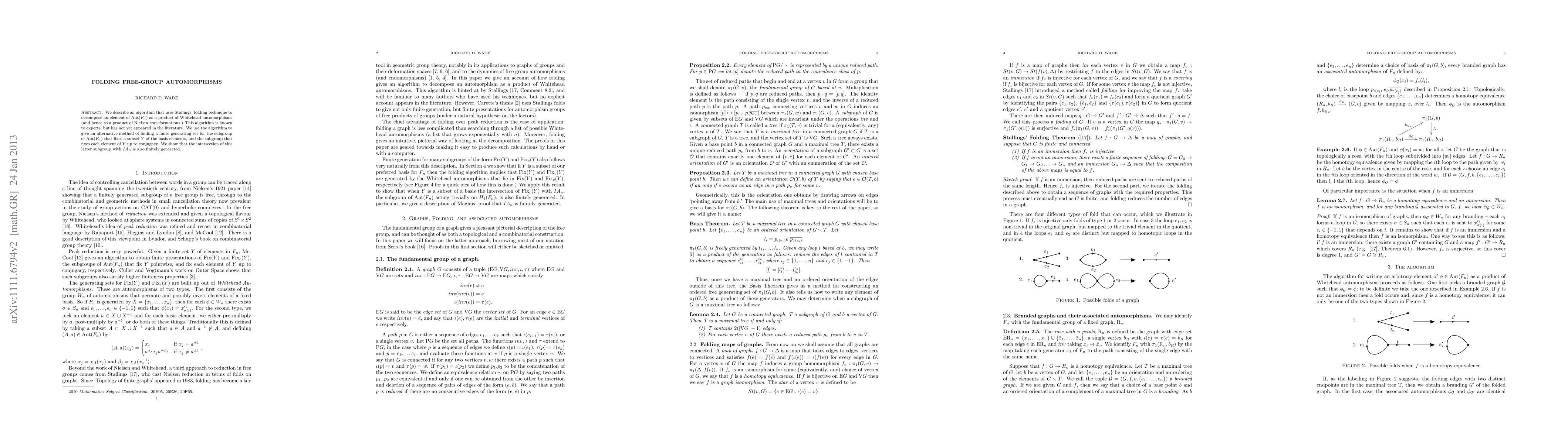 We describe an algorithm that uses Stallings' folding technique to decompose an element of $Aut(F_n)$ as a product of Whitehead automorphisms (and hence as a product of Nielsen transformations.) We use this to give an alternative method of finding a finite generating set for the subgroup of $Aut(F_n)$ that fixes a subset $Y$ of the basis elements, and the subgroup that fixes each element of $Y$ up to conjugacy. We show that the intersection of this latter subgroup with $IA_n$ is also finitely generated.