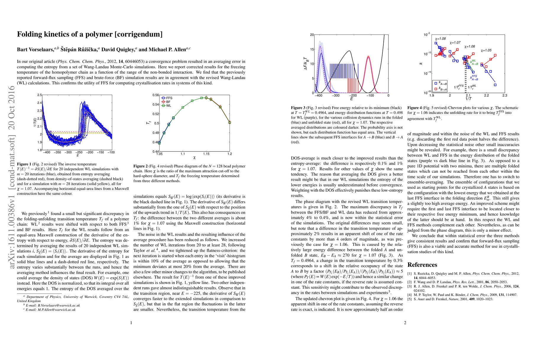 In our original article (Phys. Chem. Chem. Phys., 2012, 14, 60446053) a convergence problem resulted in an averaging error in computing the entropy from a set of Wang-Landau Monte-Carlo simulations. Here we report corrected results for the freezing temperature of the homopolymer chain as a function of the range of the non-bonded interaction. We find that the previously reported forward-flux sampling (FFS) and brute-force (BF) simulation results are in agreement with the revised Wang-Landau (WL) calculations. This confirms the utility of FFS for computing crystallisation rates in systems of this kind.