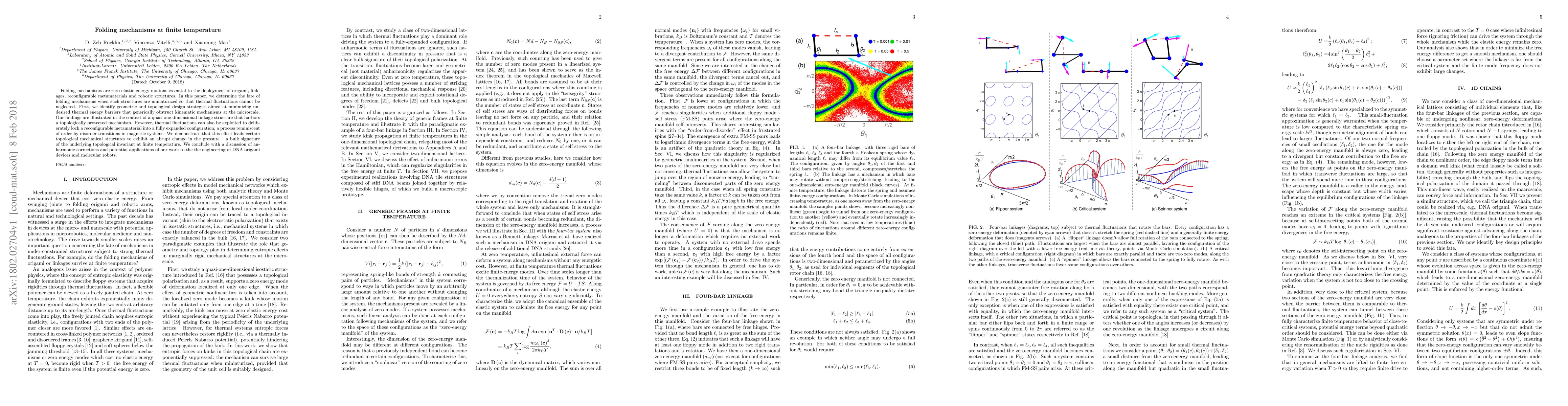 Folding mechanisms are zero elastic energy motions essential to the deployment of origami, linkages, reconfigurable metamaterials and robotic structures. In this paper, we determine the fate of folding mechanisms when such structures are miniaturized so that thermal fluctuations cannot be neglected. First, we identify geometric and topological design strategies aimed at minimizing undesired thermal energy barriers that generically obstruct kinematic mechanisms at the microscale. Our findings are illustrated in the context of a quasi one-dimensional linkage structure that harbors a topologically protected mechanism. However, thermal fluctuations can also be exploited to deliberately lock a reconfigurable metamaterial into a fully expanded configuration, a process reminiscent of order by disorder transitions in magnetic systems. We demonstrate that this effect leads certain topological mechanical structures to exhibit an abrupt change in the pressure -- a bulk signature of the underlying topological invariant at finite temperature. We conclude with a discussion of anharmonic corrections and potential applications of our work to the the engineering of DNA origami devices and molecular robots.