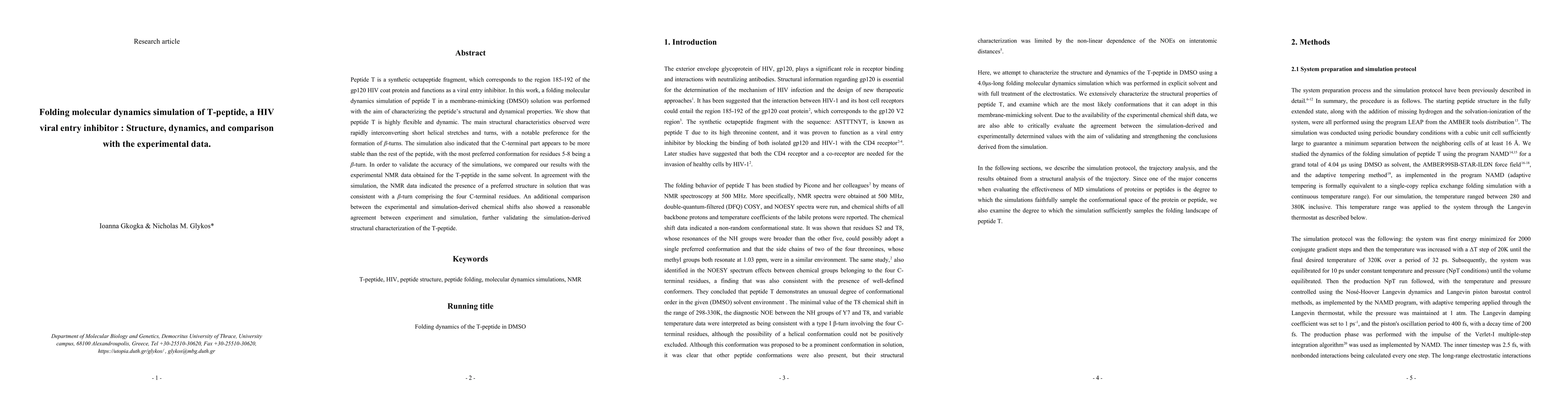 A molecular dynamics simulation of peptide T reveals its high flexibility and dynamic nature, with a preferred structure that includes a beta-turn motif, validated by experimental NMR data.