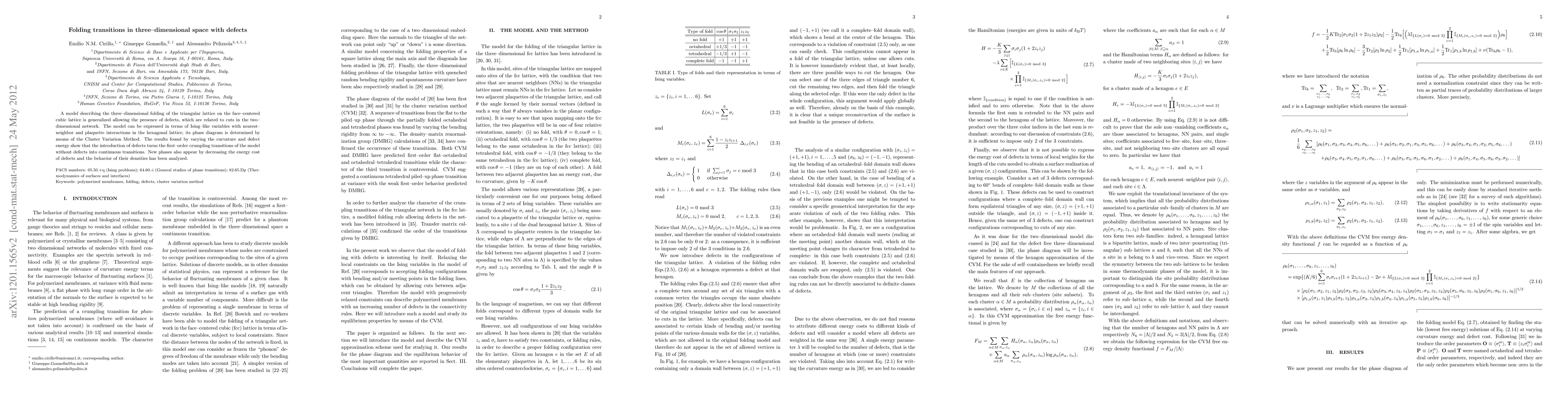 A model describing the three-dimensional folding of the triangular lattice on the face-centered cubic lattice is generalized allowing the presence of defects corresponding to cuts in the two-dimensional network. The model can be expressed in terms of Ising-like variables with nearest-neighbor and plaquette interactions in the hexagonal lattice; its phase diagram is determined by the Cluster Variation Method. The results found by varying the curvature and defect energy show that the introduction of defects turns the first-order crumpling transitions of the model without defects into continuous transitions. New phases also appear by decreasing the energy cost of defects and the behavior of their densities has been analyzed.