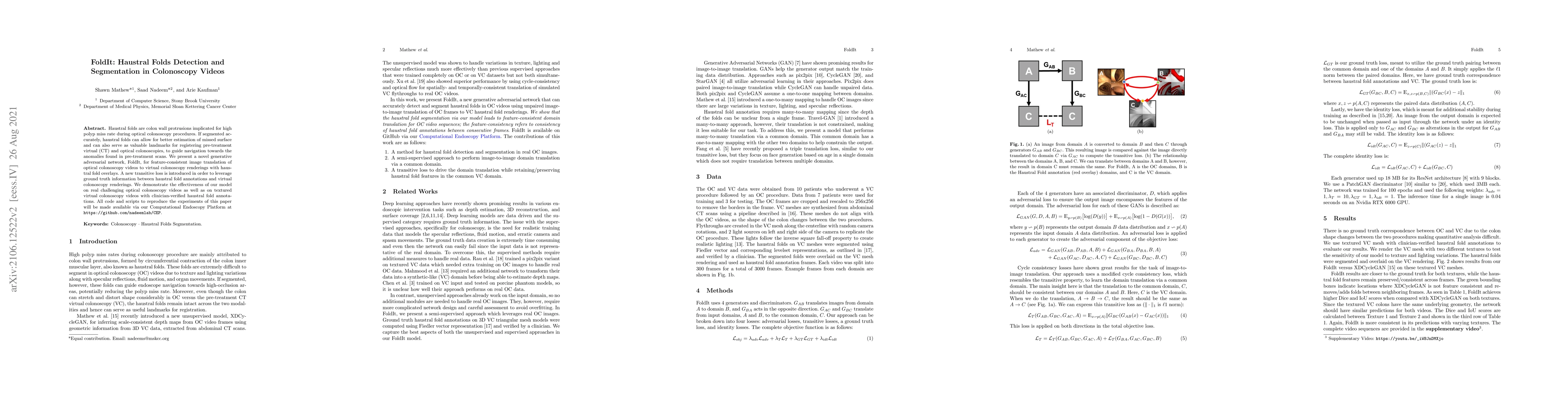 This paper introduces FoldIt, a generative adversarial network for detecting and segmenting haustral folds in colonoscopy videos, aiming to improve polyp detection and registration of virtual and optical colonoscopies. The model uses a new transitive loss to enhance feature consistency between annotations and renderings, validated on real and virtual colonoscopy videos.