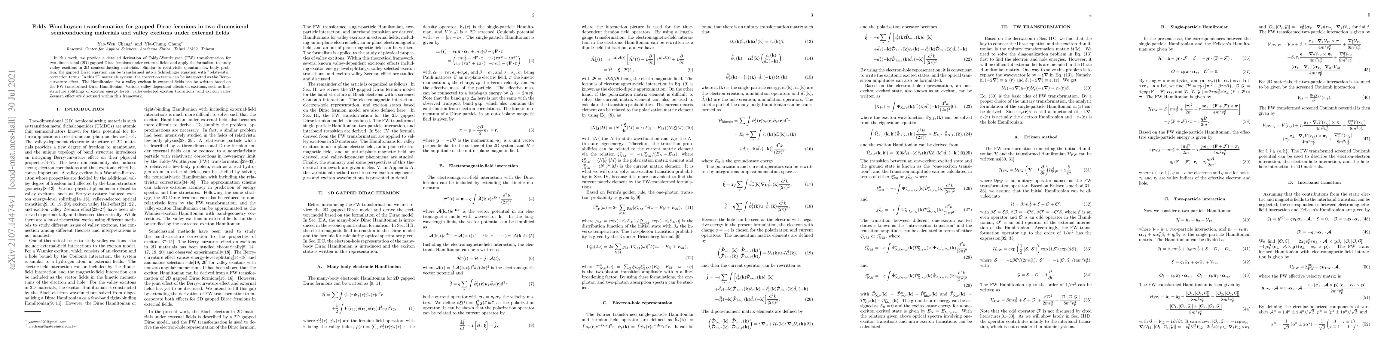 This research paper details the derivation of the Foldy-Wouthuysen transformation for two-dimensional gapped Dirac fermions in semiconducting materials under external fields and applies it to study valley excitons. The transformation simplifies the Dirac equation into a Schrödinger-like form with relativistic corrections interpreted as Berry-curvature effects, facilitating the analysis of exciton dynamics including fine-structure splittings and valley-selective transitions.