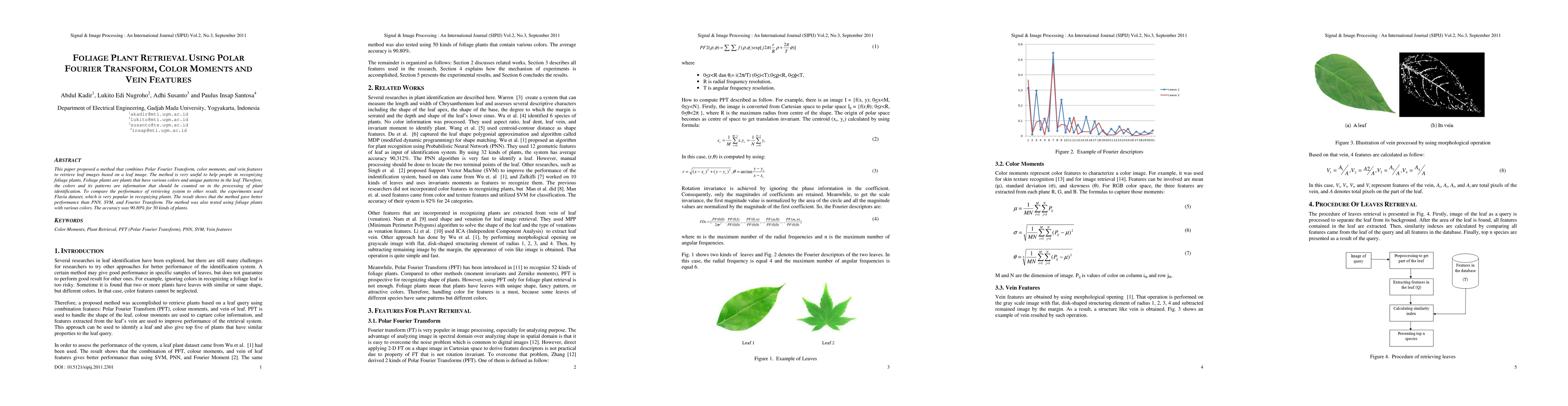 This paper proposed a method that combines Polar Fourier Transform, color moments, and vein features to retrieve leaf images based on a leaf image. The method is very useful to help people in recognizing foliage plants. Foliage plants are plants that have various colors and unique patterns in the leaf. Therefore, the colors and its patterns are information that should be counted on in the processing of plant identification. To compare the performance of retrieving system to other result, the experiments used Flavia dataset, which is very popular in recognizing plants. The result shows that the method gave better performance than PNN, SVM, and Fourier Transform. The method was also tested using foliage plants with various colors. The accuracy was 90.80% for 50 kinds of plants.