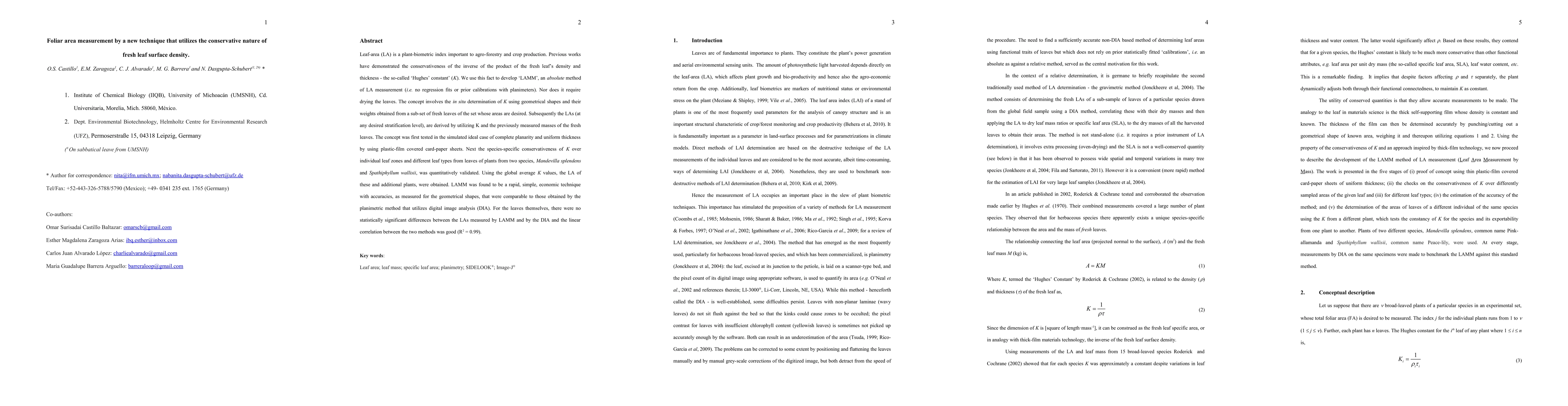 Leaf area LA, is a plant biometric index important to agroforestry and crop production. Previous works have demonstrated the conservativeness of the inverse of the product of the fresh leaf density and thickness, the so-called Hughes constant, K. We use this fact to develop LAMM, an absolute method of LA measurement, i.e. no regression fits or prior calibrations with planimeters. Nor does it require drying the leaves. The concept involves the in situ determination of K using geometrical shapes and their weights obtained from a subset of fresh leaves of the set whose areas are desired. Subsequently the LAs, at any desired stratification level, are derived by utilizing K and the previously measured masses of the fresh leaves. The concept was first tested in the simulated ideal case of complete planarity and uniform thickness by using plastic film covered card-paper sheets. Next the species-specific conservativeness of K over individual leaf zones and different leaf types from leaves of plants from two species, Mandevilla splendens and Spathiphyllum wallisii, was quantitatively validated. Using the global average K values, the LA of these and additional plants, were obtained. LAMM was found to be a rapid, simple, economic technique with accuracies, as measured for the geometrical shapes, that were comparable to those obtained by the planimetric method that utilizes digital image analysis, DIA. For the leaves themselves, there were no statistically significant differences between the LAs measured by LAMM and by the DIA and the linear correlation between the two methods was excellent.