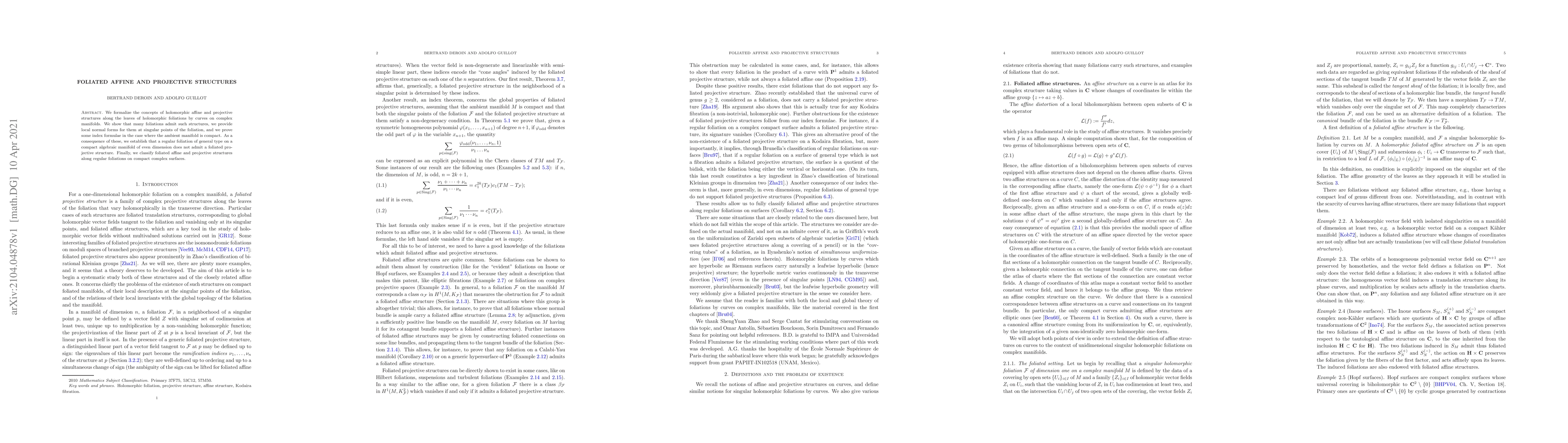 This paper formalizes holomorphic affine and projective structures along the leaves of complex manifold foliations, providing local normal forms and index formulae. It concludes that regular foliations of general type on compact algebraic manifolds of even dimension lack foliated projective structures, and classifies such structures on compact complex surfaces.
