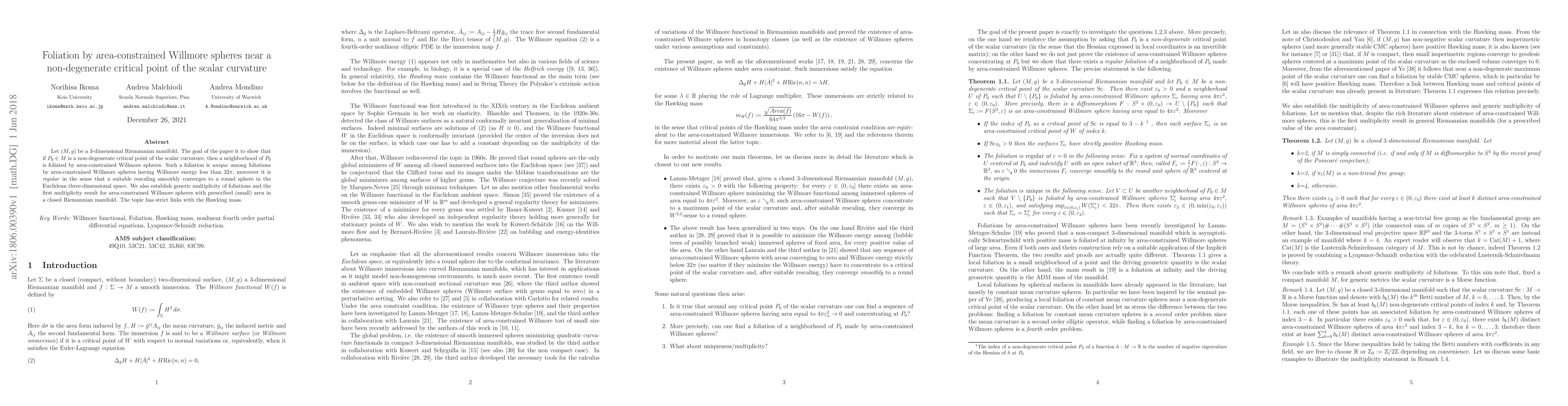 This paper demonstrates that a neighborhood around a non-degenerate critical point of scalar curvature in a 3-dimensional Riemannian manifold is foliated by area-constrained Willmore spheres, with this foliation being unique and regular. The study also explores the generic multiplicity of such foliations and establishes the first multiplicity result for small-area Willmore spheres.