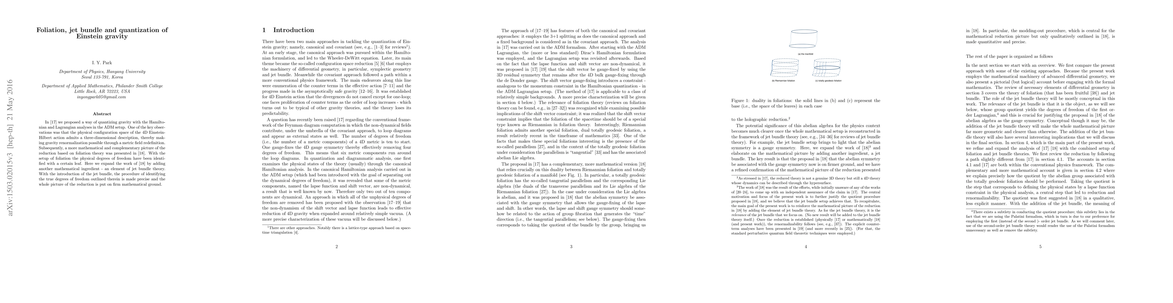This research paper explores a new way to understand gravity using mathematical concepts like foliation theory, jet bundle theory, and quantization. It aims to identify the true physical degrees of freedom in Einstein gravity.