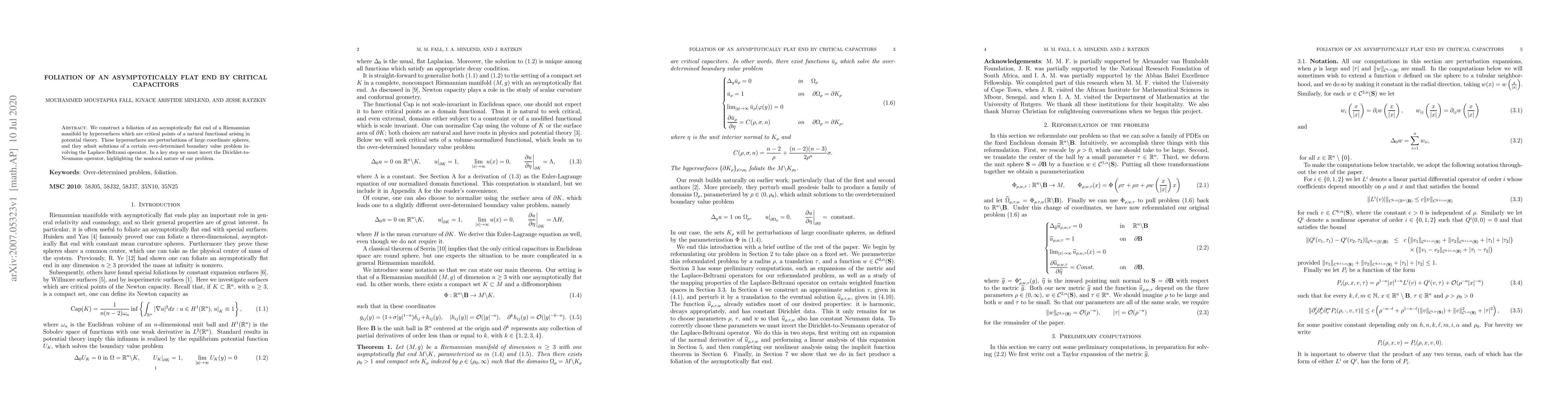 We construct a foliation of an asymptotically flat end of a Riemannian manifold by hypersurfaces which are critical points of a natural functional arising in potential theory. These hypersurfaces are perturbations of large coordinate spheres, and they admit solutions of a certain over-determined boundary value problem involving the Laplace-Beltrami operator. In a key step we must invert the Dirichlet-to-Neumann operator, highlighting the non-local nature of our problem