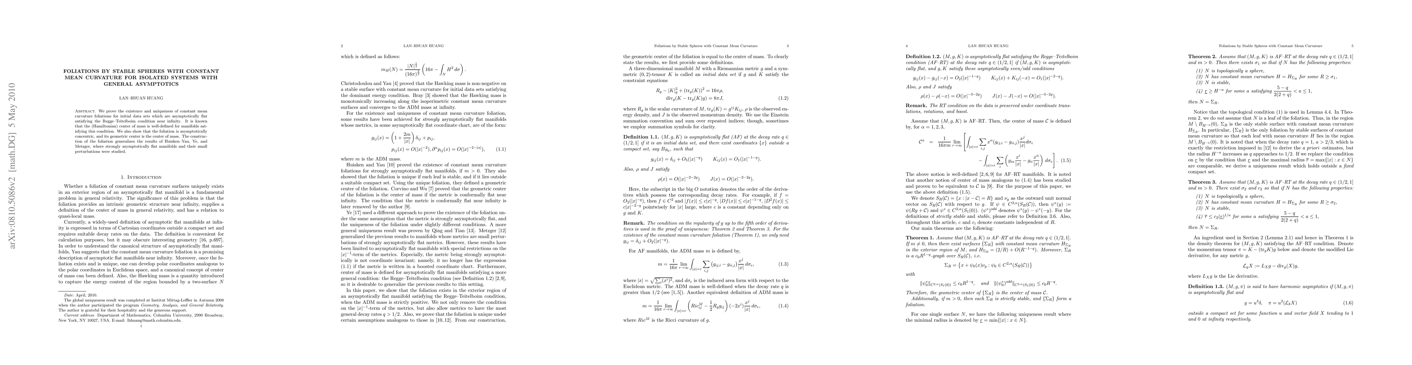 This research paper proves the existence and uniqueness of constant mean curvature foliations for initial data sets that are asymptotically flat and meet the Regge-Teitelboim condition near infinity. The foliation is shown to be asymptotically concentric, with its geometric center matching the well-defined Hamiltonian center of mass for such systems. This work builds upon previous findings by Huisken-Yau, Ye, and Metzger, focusing on strongly asymptotically flat manifolds and their small perturbations.