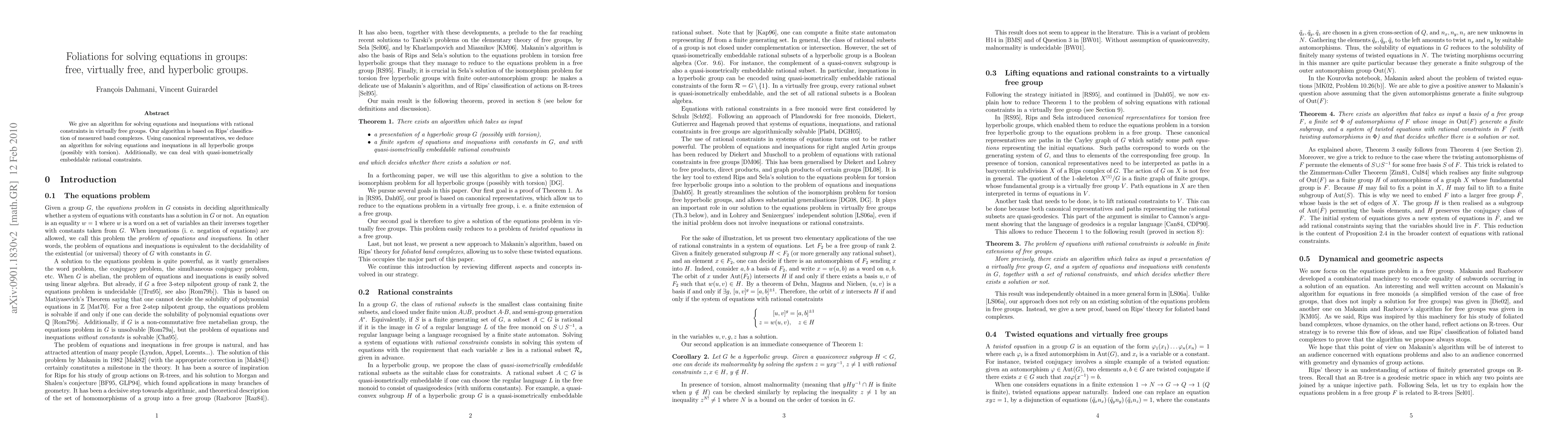 **Summary:** This paper presents an algorithm for solving equations and inequations with rational constraints in virtually free groups, leveraging Rips' classification of measured band complexes. It extends the approach to hyperbolic groups, potentially including those with torsion, and addresses quasi-isometrically embeddable rational constraints.