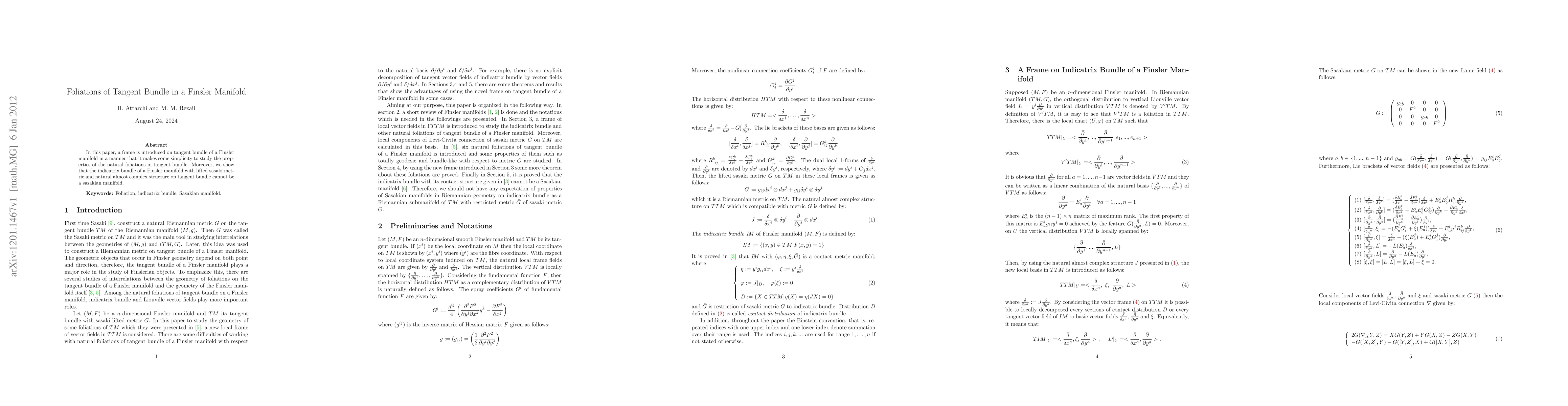 This paper introduces a frame on the tangent bundle of a Finsler manifold to simplify the study of natural foliations, and demonstrates that the indicatrix bundle with a lifted Sasaki metric and natural almost complex structure cannot be a Sasakian manifold.