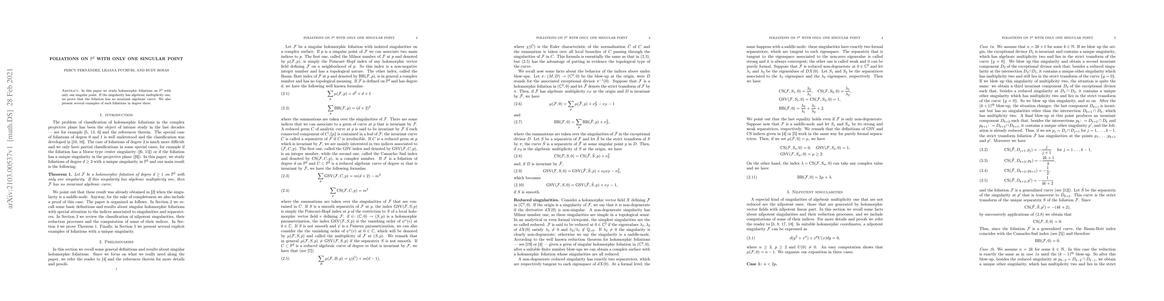 This paper examines holomorphic foliations on the complex projective plane $\mathbb{P}^2$ with a single singular point. It proves that foliations with a singularity of algebraic multiplicity one do not have invariant algebraic curves and provides examples of degree three foliations.