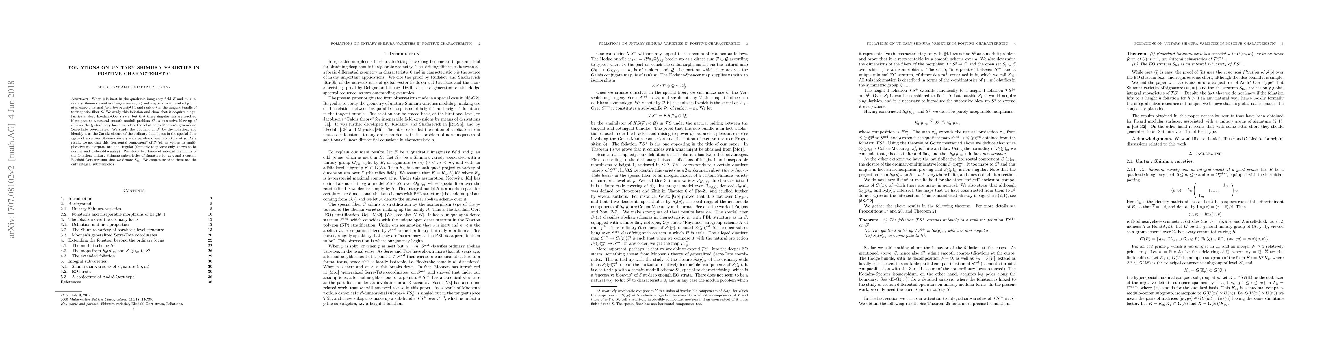 This research investigates foliations on unitary Shimura varieties in positive characteristic, revealing that these foliations have singularities at specific strata, which are resolved in a smooth moduli problem. The study connects the foliation to Moonen's coordinates over the ordinary locus and identifies the quotient of this smooth problem as the Zariski closure of the ordinary-'etale locus in the special fiber of another Shimura variety. The paper concludes with a conjecture about the integral submanifolds of the foliation, asserting that unitary Shimura subvarieties and a particular Ekedahl-Oort stratum are the only ones.