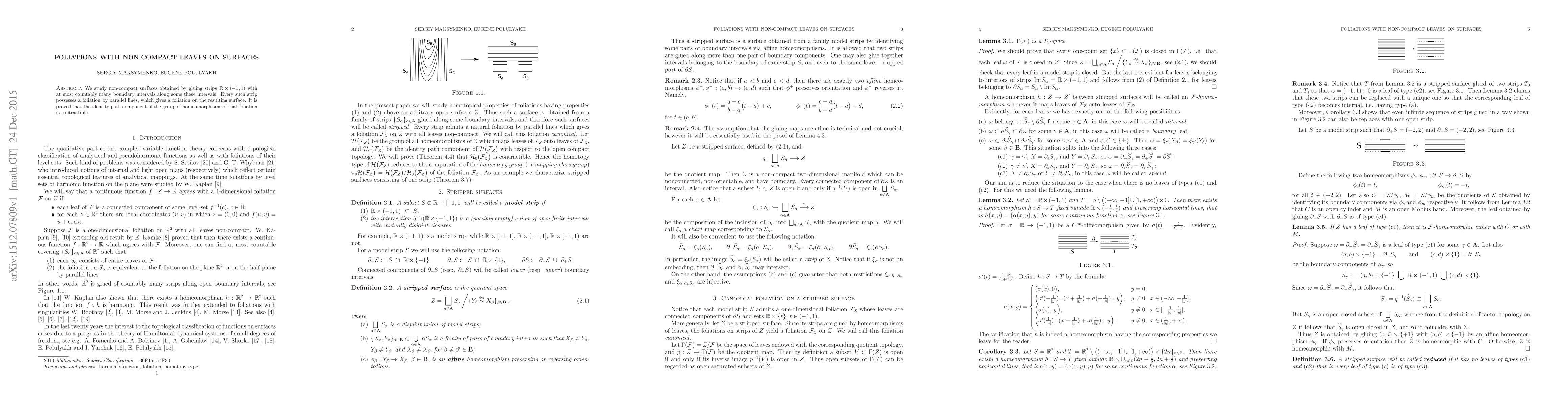 We study non-compact surfaces obtained by gluing strips $\mathbb{R}\times(-1,1)$ with at most countably many boundary intervals along some these intervals. Every such strip possesses a foliation by parallel lines, which gives a foliation on the resulting surface. It is proved that the identity path component of the group of homeomorphisms of that foliation is contractible.