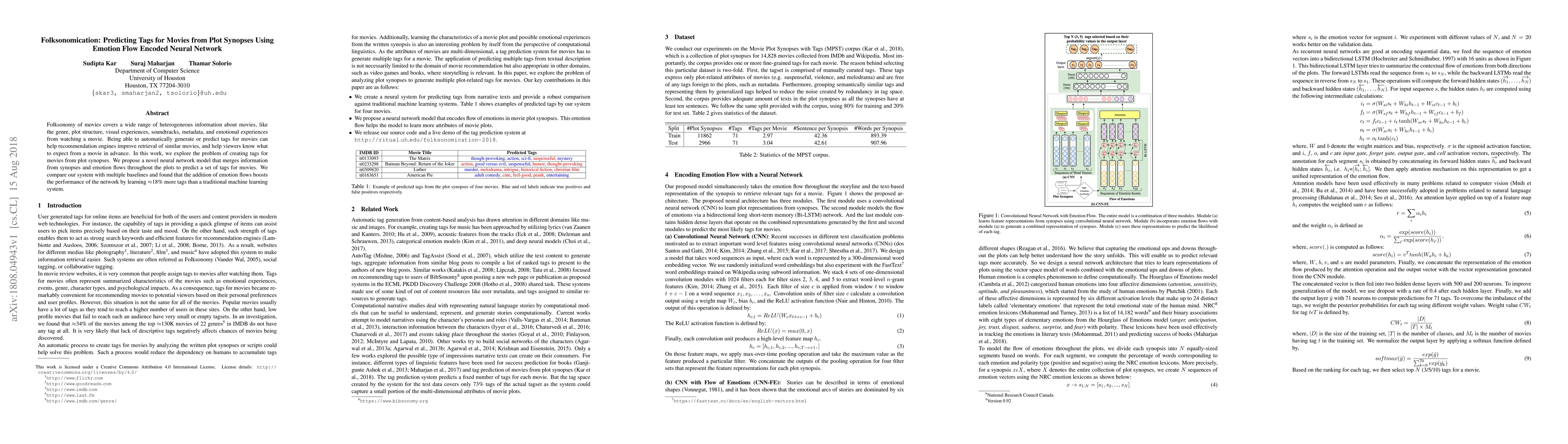 This paper proposes a neural network model to predict movie tags from plot synopses by incorporating emotion flow throughout the plot. The model outperforms traditional machine learning systems, achieving an ~18% improvement in tag prediction accuracy.