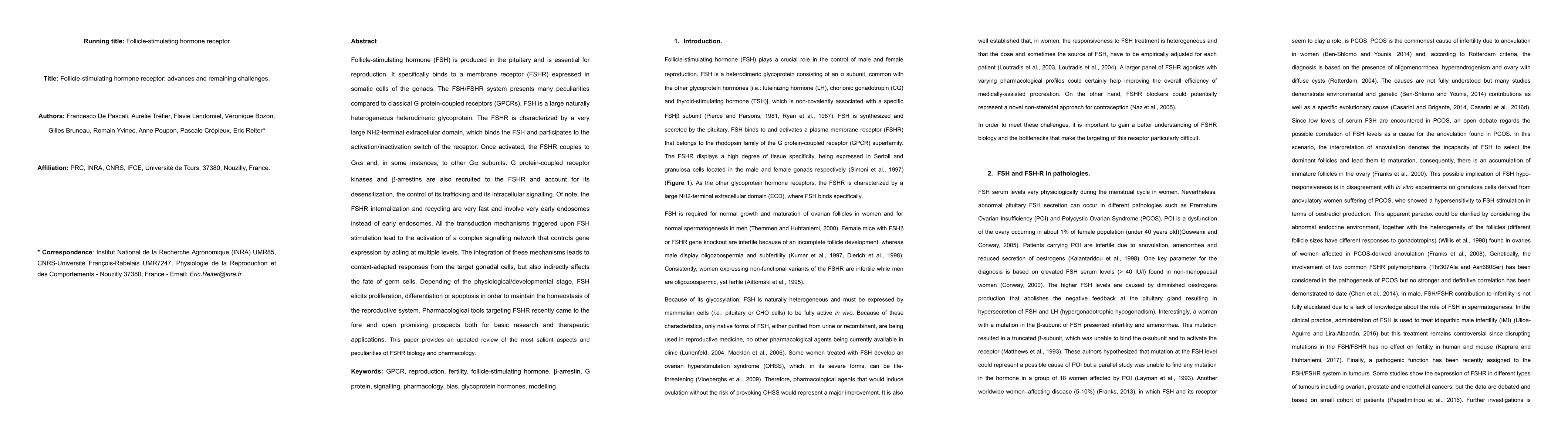Follicle-stimulating hormone (FSH) is produced in the pituitary and is essential for reproduction. It specifically binds to a membrane receptor (FSHR) expressed in somatic cells of the gonads. The FSH/FSHR system presents many peculiarities compared to classical G protein-coupled receptors (GPCRs). FSH is a large naturally heterogeneous heterodimeric glycoprotein. The FSHR is characterized by a very large NH2-terminal extracellular domain, which binds the FSH and participates to the activation/inactivation switch of the receptor. Once activated, the FSHR couples to G{\alpha}s and, in some instances, to other G{\alpha} subunits. G protein-coupled receptor kinases and \beta-arrestins are also recruited to the FSHR and account for its desensitization, the control of its trafficking and its intracellular signalling. Of note, the FSHR internalization and recycling are very fast and involve very early endosomes instead of early endosomes. All the transduction mechanisms triggered upon FSH stimulation lead to the activation of a complex signalling network that controls gene expression by acting at multiple levels. The integration of these mechanisms leads to context-adapted responses from the target gonadal cells, but also indirectly affects the fate of germ cells. Depending of the physiological/developmental stage, FSH elicits proliferation, differentiation or apoptosis in order to maintain the homeostasis of the reproductive system. Pharmacological tools targeting FSHR recently came to the fore and open promising prospects both for basic research and therapeutic applications. This paper provides an updated review of the most salient aspects and peculiarities of FSHR biology and pharmacology.