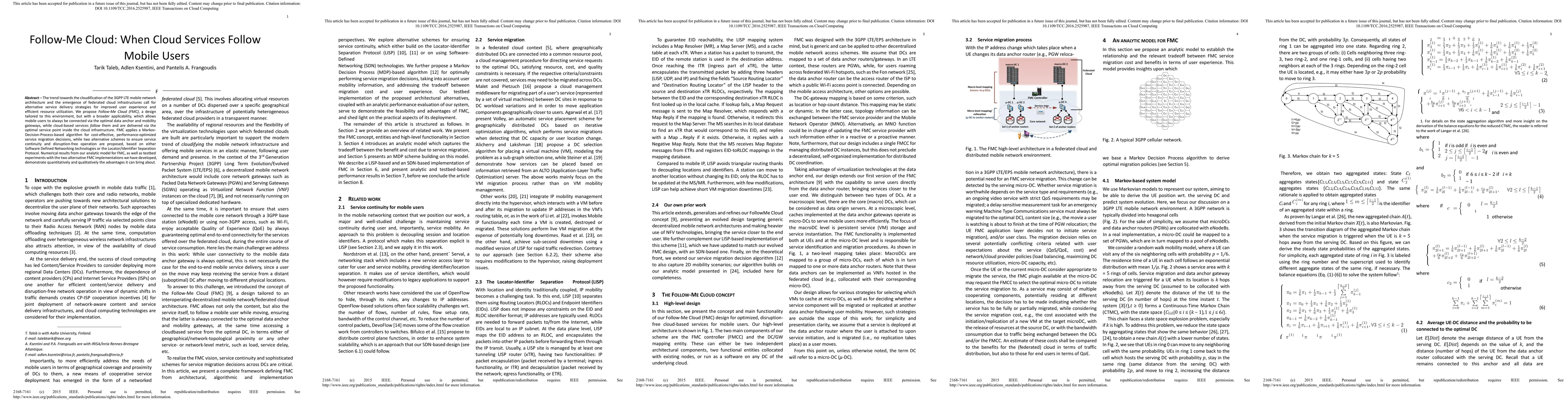 Follow-Me Cloud allows mobile users to stay connected with optimal data anchors while cloud services follow them for improved user experience and efficient resource utilization. The proposed algorithm and implementation demonstrate cost-effective and performance-optimized service migration decisions.