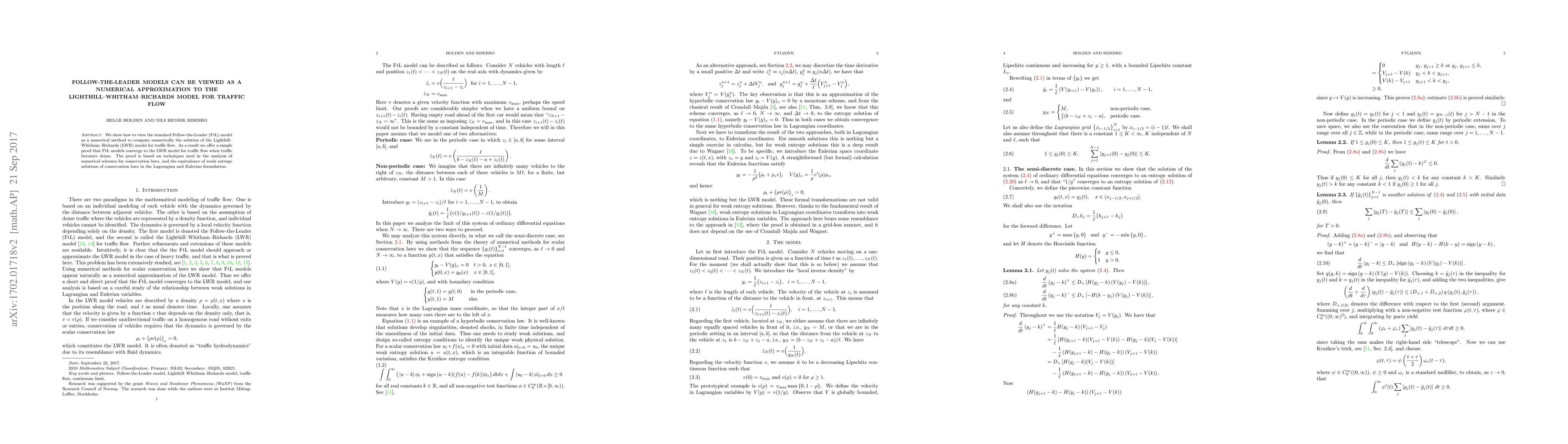 This paper demonstrates that the Follow-the-Leader (FtL) model serves as a numerical approximation for solving the Lighthill-Whitham-Richards (LWR) model in traffic flow. It provides a proof that FtL models converge to the LWR model under dense traffic conditions, utilizing techniques from numerical conservation laws and entropy solutions.