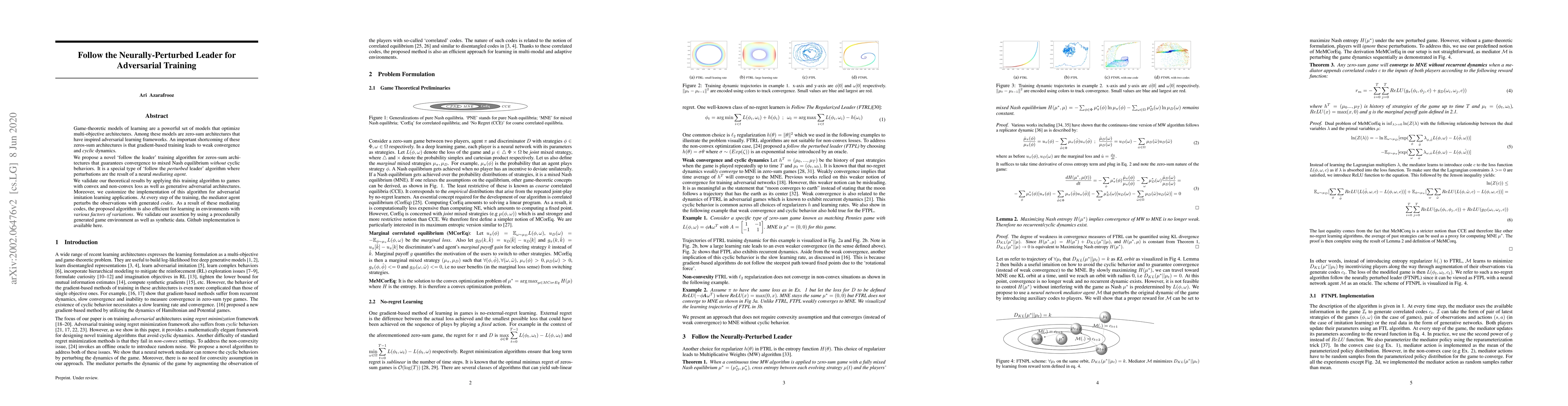 Game-theoretic models of learning are a powerful set of models that optimize multi-objective architectures. Among these models are zero-sum architectures that have inspired adversarial learning frameworks. An important shortcoming of these zeros-sum architectures is that gradient-based training leads to weak convergence and cyclic dynamics. We propose a novel follow the leader training algorithm for zeros-sum architectures that guarantees convergence to mixed Nash equilibrium without cyclic behaviors. It is a special type of follow the perturbed leader algorithm where perturbations are the result of a neural mediating agent. We validate our theoretical results by applying this training algorithm to games with convex and non-convex loss as well as generative adversarial architectures. Moreover, we customize the implementation of this algorithm for adversarial imitation learning applications. At every step of the training, the mediator agent perturbs the observations with generated codes. As a result of these mediating codes, the proposed algorithm is also efficient for learning in environments with various factors of variations. We validate our assertion by using a procedurally generated game environment as well as synthetic data. Github implementation is available.