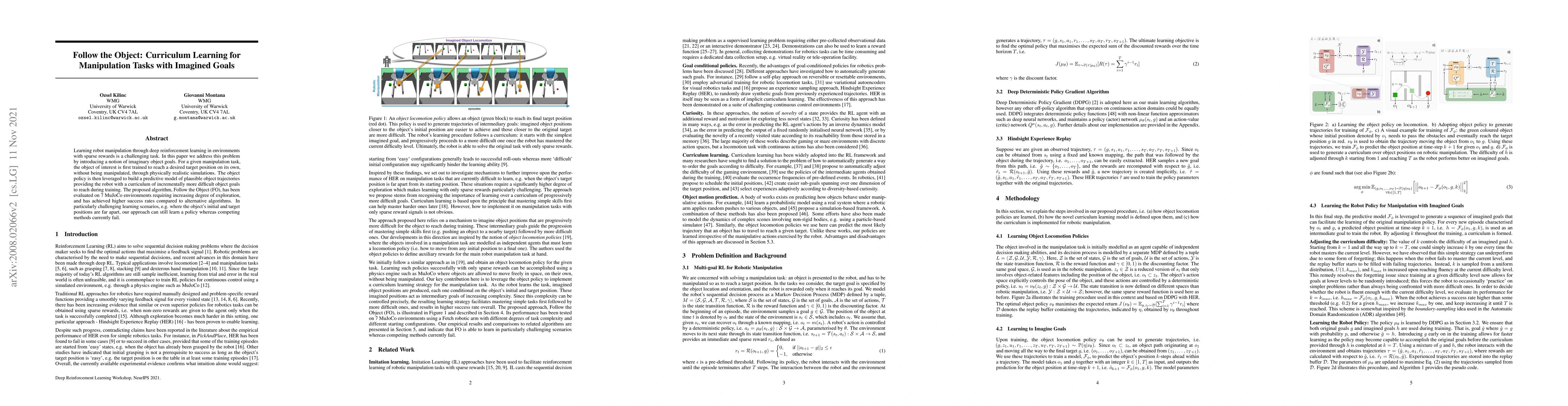 Learning robot manipulation through deep reinforcement learning in environments with sparse rewards is a challenging task. In this paper we address this problem by introducing a notion of imaginary object goals. For a given manipulation task, the object of interest is first trained to reach a desired target position on its own, without being manipulated, through physically realistic simulations. The object policy is then leveraged to build a predictive model of plausible object trajectories providing the robot with a curriculum of incrementally more difficult object goals to reach during training. The proposed algorithm, Follow the Object (FO), has been evaluated on 7 MuJoCo environments requiring increasing degree of exploration, and has achieved higher success rates compared to alternative algorithms. In particularly challenging learning scenarios, e.g. where the object's initial and target positions are far apart, our approach can still learn a policy whereas competing methods currently fail.