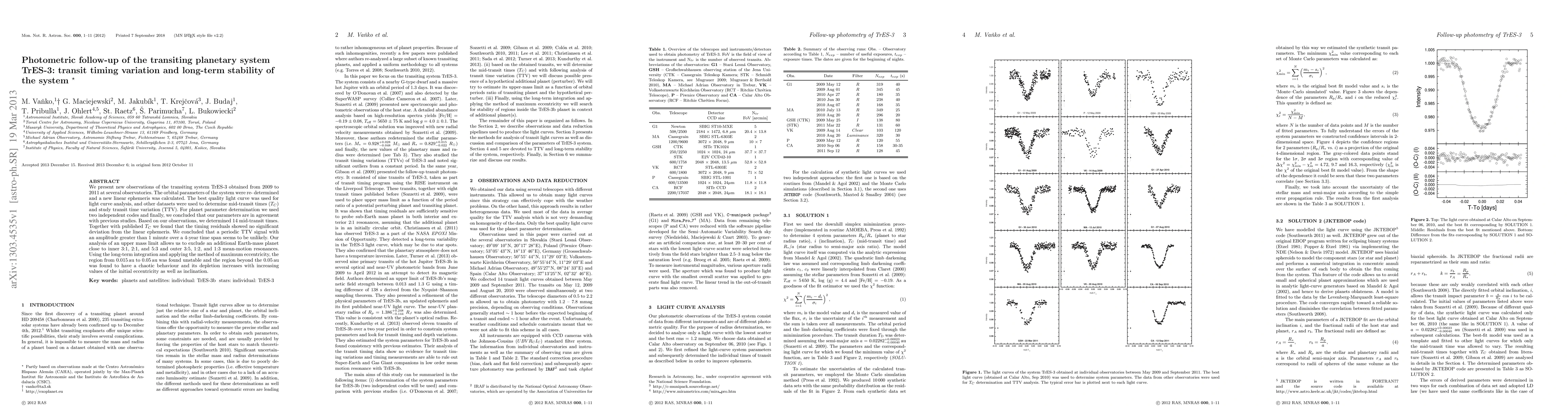 We present new observations of the transiting system TrES-3 obtained from 2009 to 2011 at several observatories. The orbital parameters of the system were re- determined and a new linear ephemeris was calculated. The best quality light curve was used for light curve analysis, an other datasets were used to determine mid-transit times, Tc, and study transit time variation (TTV). For planet parameter determination we used two independent codes and finally, we concluded that our parameters are in agreement with previous studies. Based on our observations, we determined 14 mid-transit times. Together with published Tc we found that the timing residuals showed no significant deviation from the linear ephemeris. We concluded that a periodic TTV signal with an amplitude greater than 1 minute over a 4-year time span seems to be unlikely. Our analysis of an upper mass limit allows us to exclude an additional Earth-mass planet close to inner 3:1, 2:1, and 5:3 and outer 3:5, 1:2, and 1:3 mean-motion resonances. Using the long-term integration and applying the method of maximum eccentricity, the region from 0.015 au to 0.05 au was found unstable and the region beyond the 0.05 au was found to have a chaotic behaviour and its depletion increases with increasing values of the initial eccentricity as well as inclination.