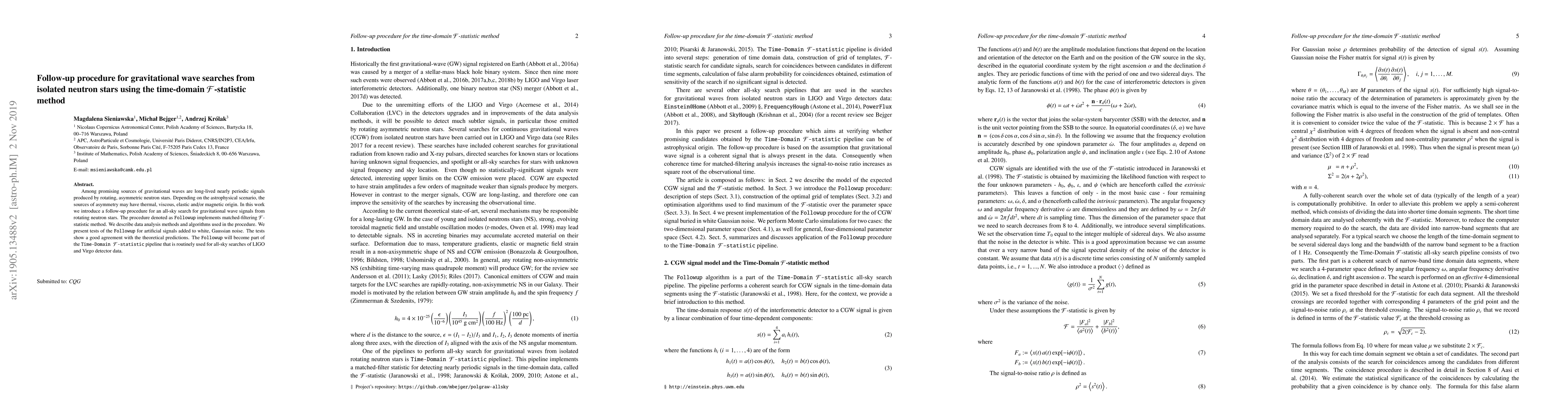 This paper introduces a follow-up procedure named Followup for detecting gravitational waves from rotating, asymmetric neutron stars using the $\mathcal{F}$-statistic method. Tests on artificial signals embedded in noise show good agreement with theoretical predictions, indicating the method's effectiveness.