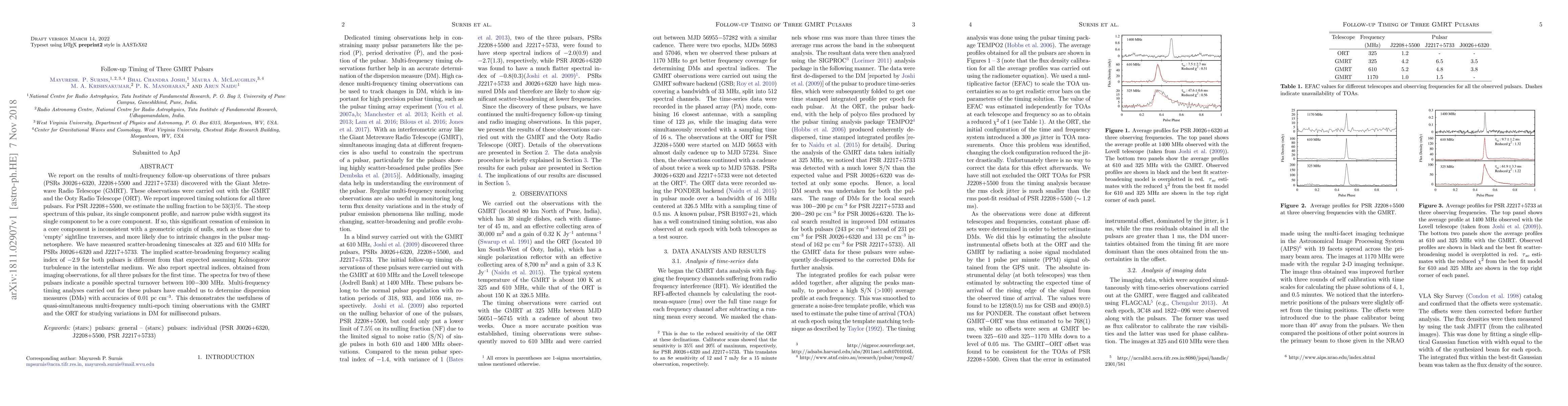We report on the results of multi-frequency follow-up observations of three pulsars (PSRs J0026+6320, J2208+5500 and J2217+5733) discovered with the Giant Metrewave Radio Telescope (GMRT). These observations were carried out with the GMRT and the Ooty Radio Telescope (ORT). We report improved timing solutions for all three pulsars. For PSR J2208+5500, we estimate the nulling fraction to be 53(3)\%. The steep spectrum of this pulsar, its single component profile, and narrow pulse width suggest its single component to be a core component. If so, this significant cessation of emission in a core component is inconsistent with a geometric origin of nulls, such as those due to `empty' sightline traverses, and more likely due to intrinsic changes in the pulsar magnetosphere. We have measured scatter-broadening timescales at 325 and 610 MHz for PSRs J0026+6320 and J2217+5733. The implied scatter-broadening frequency scaling index of $-$2.9 for both pulsars is different from that expected assuming Kolmogorov turbulence in the interstellar medium. We also report spectral indices, obtained from imaging observations, for all three pulsars for the first time. The spectra for two of these pulsars indicate a possible spectral turnover between 100$-$300 MHz. Multi-frequency timing analyses carried out for these pulsars have enabled us to determine dispersion measures (DMs) with accuracies of 0.01 pc cm\sups{--3}. This demonstrates the usefulness of quasi-simultaneous multi-frequency multi-epoch timing observations with the GMRT and the ORT for studying variations in DM for millisecond pulsars.