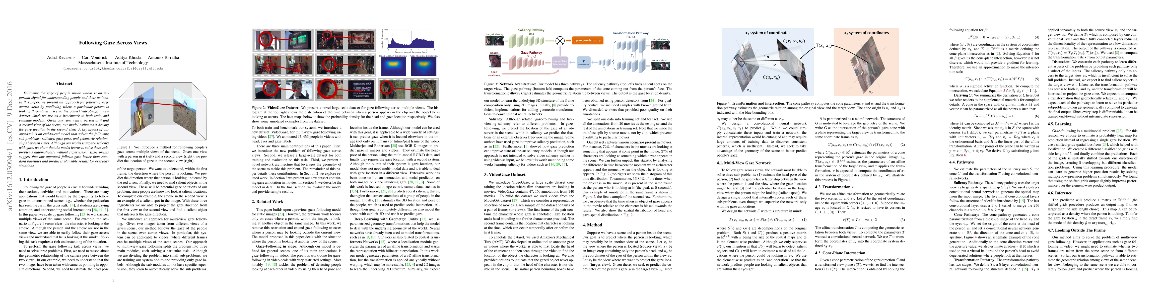 Following the gaze of people inside videos is an important signal for understanding people and their actions. In this paper, we present an approach for following gaze across views by predicting where a particular person is looking throughout a scene. We collect VideoGaze, a new dataset which we use as a benchmark to both train and evaluate models. Given one view with a person in it and a second view of the scene, our model estimates a density for gaze location in the second view. A key aspect of our approach is an end-to-end model that solves the following sub-problems: saliency, gaze pose, and geometric relationships between views. Although our model is supervised only with gaze, we show that the model learns to solve these subproblems automatically without supervision. Experiments suggest that our approach follows gaze better than standard baselines and produces plausible results for everyday situations.