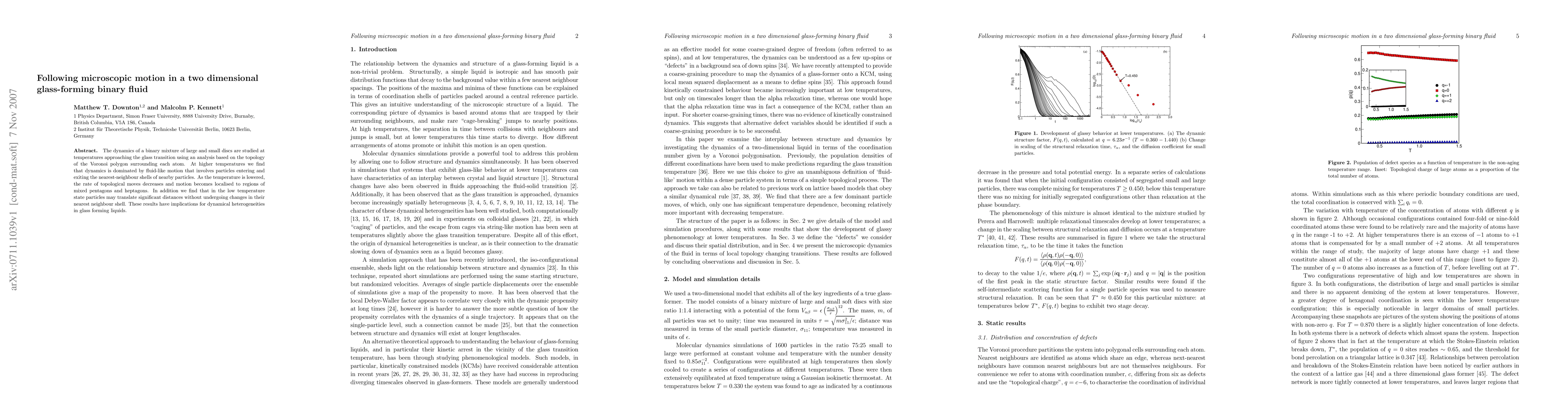 The dynamics of a binary mixture of large and small discs are studied at temperatures approaching the glass transition using an analysis based on the topology of the Voronoi polygon surrounding each atom. At higher temperatures we find that dynamics is dominated by fluid-like motion that involves particles entering and exiting the nearest-neighbour shells of nearby particles. As the temperature is lowered, the rate of topological moves decreases and motion becomes localised to regions of mixed pentagons and heptagons. In addition we find that in the low temperature state particles may translate significant distances without undergoing changes in their nearest neig hbour shell. These results have implications for dynamical heterogeneities in glass forming liquids.