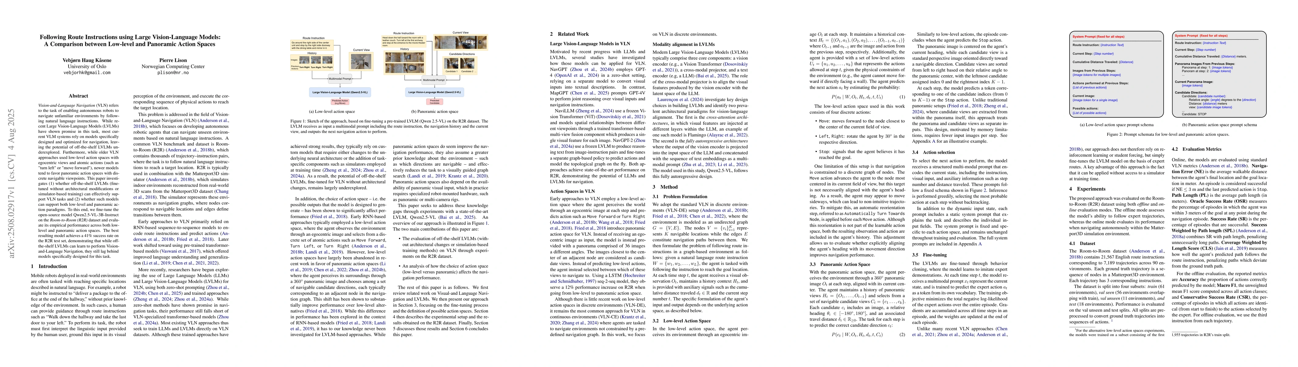 Vision-and-Language Navigation (VLN) refers to the task of enabling autonomous robots to navigate unfamiliar environments by following natural language instructions. While recent Large Vision-Language Models (LVLMs) have shown promise in this task, most current VLM systems rely on models specifically designed and optimized for navigation, leaving the potential of off-the-shelf LVLMs underexplored. Furthermore, while older VLN approaches used low-level action spaces with egocentric views and atomic actions (such as "turn left" or "move forward"), newer models tend to favor panoramic action spaces with discrete navigable viewpoints. This paper investigates (1) whether off-the-shelf LVLMs (fine-tuned without architectural modifications or simulator-based training) can effectively support VLN tasks and (2) whether such models can support both low-level and panoramic action paradigms. To this end, we fine-tune the open-source model Qwen2.5-VL-3B-Instruct on the Room-to-Room (R2R) dataset and evaluate its empirical performance across both low-level and panoramic action spaces. The best resulting model achieves a 41% success rate on the R2R test set, demonstrating that while off-the-shelf LVLMs can learn to perform Vision-and-Language Navigation, they still lag behind models specifically designed for this task.