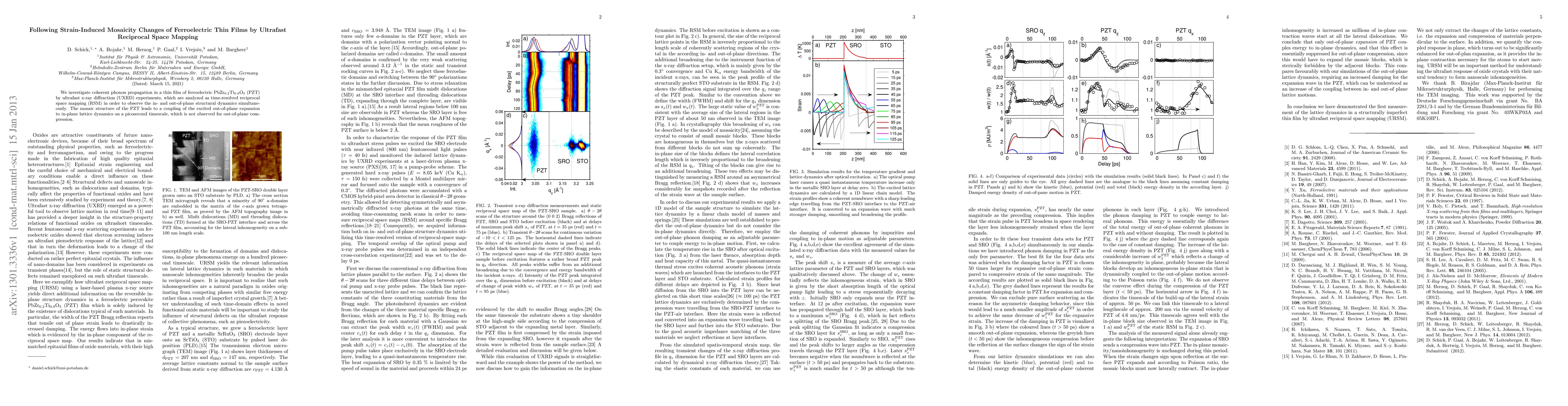 We investigate coherent phonon propagation in a thin film of ferroelectric PbZr0.2Ti0.8O3 (PZT) by ultrafast x-ray diffraction (UXRD) experiments, which are analyzed as time-resolved reciprocal space mapping (RSM) in order to observe the in- and out-of-plane structural dynamics simultaneously. The mosaic structure of the PZT leads to a coupling of the excited out-of-plane expansion to in-plane lattice dynamics on a picosecond timescale, which is not observed for out-of-plane compression.