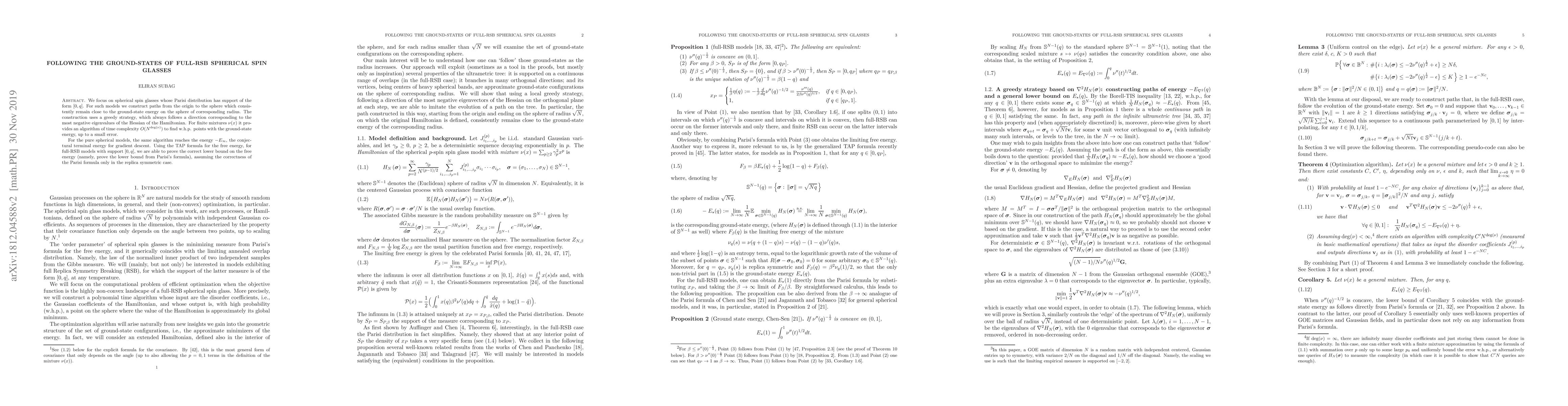 This research constructs paths for spherical spin glasses to consistently stay near their ground-state energy, using a greedy strategy based on the most negative eigenvalues of the Hamiltonian's Hessian. It provides an efficient algorithm for finding ground-state energy points with a time complexity of O(N^{{ m deg}( u)}), and proves a lower bound on the free energy for full-RSB models with support [0,q], assuming the Parisi formula's correctness in the replica symmetric case.