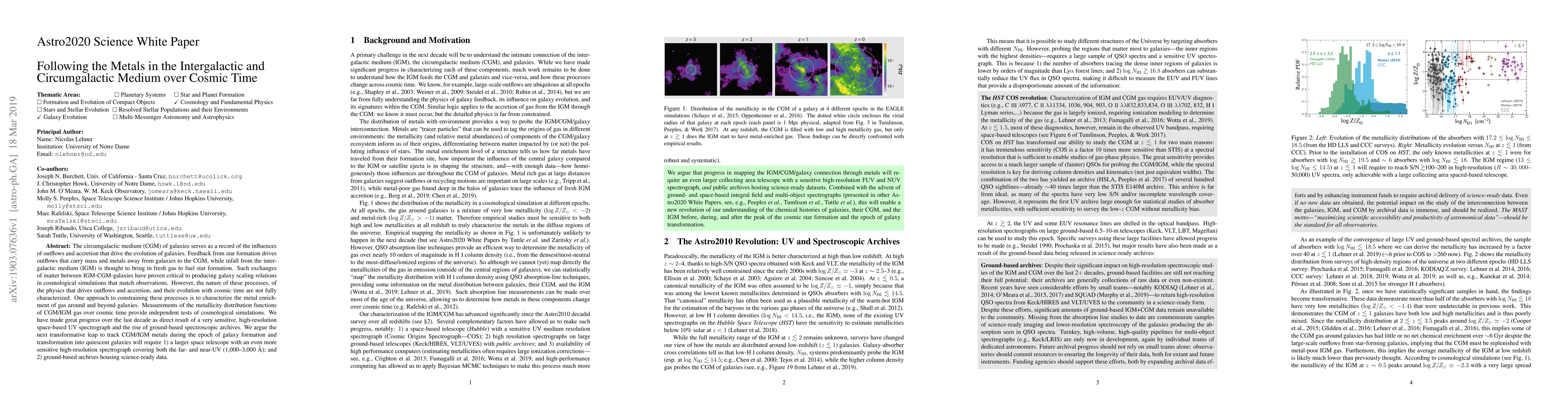 The circumgalactic medium (CGM) of galaxies serves as a record of the influences of outflows and accretion that drive the evolution of galaxies. Feedback from star formation drives outflows that carry mass and metals away from galaxies to the CGM, while infall from the intergalactic medium (IGM) is thought to bring in fresh gas to fuel star formation. Such exchanges of matter between IGM-CGM-galaxies have proven critical to producing galaxy scaling relations in cosmological simulations that match observations. However, the nature of these processes, of the physics that drives outflows and accretion, and their evolution with cosmic time are not fully characterized. One approach to constraining these processes is to characterize the metal enrichment of gas around and beyond galaxies. Measurements of the metallicity distribution functions of CGM/IGM gas over cosmic time provide independent tests of cosmological simulations. We have made great progress over the last decade as direct result of a very sensitive, high-resolution space-based UV spectrograph and the rise of ground-based spectroscopic archives. We argue the next transformative leap to track CGM/IGM metals during the epoch of galaxy formation and transformation into quiescent galaxies will require 1) a larger space telescope with an even more sensitive high-resolution spectrograph covering both the far- and near-UV (1,000-3,000 \AA); and 2) ground-based archives housing science-ready data.