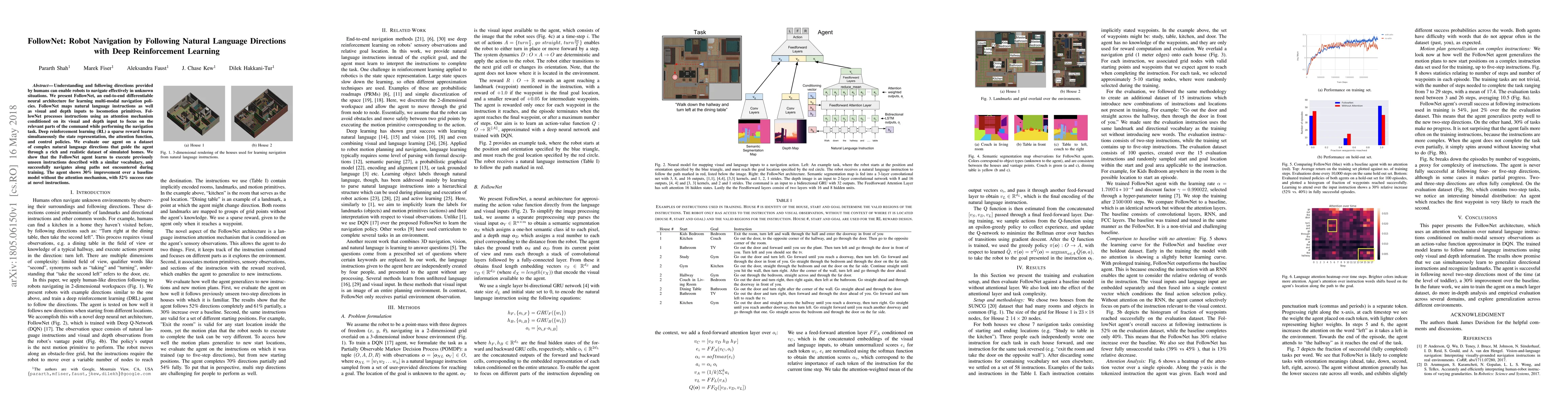 FollowNet is a neural architecture that uses deep reinforcement learning to enable robots to navigate by following natural language directions, achieving a 52% success rate on novel instructions and showing a 30% improvement over baseline models by incorporating an attention mechanism.