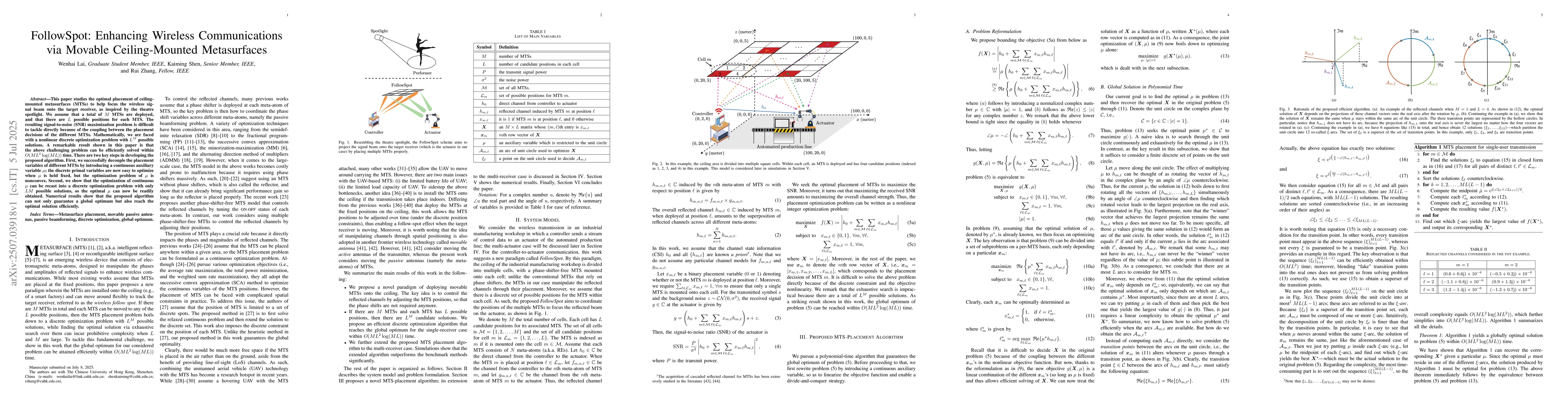 This paper studies the optimal placement of ceiling-mounted metasurfaces (MTSs) to help focus the wireless signal beam onto the target receiver, as inspired by the theatre spotlight. We assume that a total of $M$ MTSs are deployed, and that there are $L$ possible positions for each MTS. The resulting signal-to-noise (SNR) maximization problem is difficult to tackle directly because of the coupling between the placement decisions of the different MTSs. Mathematically, we are faced with a nonlinear discrete optimization problem with $L^M$ possible solutions. A remarkable result shown in this paper is that the above challenging problem can be efficiently solved within $O(ML^2\log(ML))$ time. There are two key steps in developing the proposed algorithm. First, we successfully decouple the placement variables of different MTSs by introducing a continuous auxiliary variable $\mu$; the discrete primal variables are now easy to optimize when $\mu$ is held fixed, but the optimization problem of $\mu$ is nonconvex. Second, we show that the optimization of continuous $\mu$ can be recast into a discrete optimization problem with only $LM$ possible solutions, so the optimal $\mu$ can now be readily obtained. Numerical results show that the proposed algorithm can not only guarantee a global optimum but also reach the optimal solution efficiently.