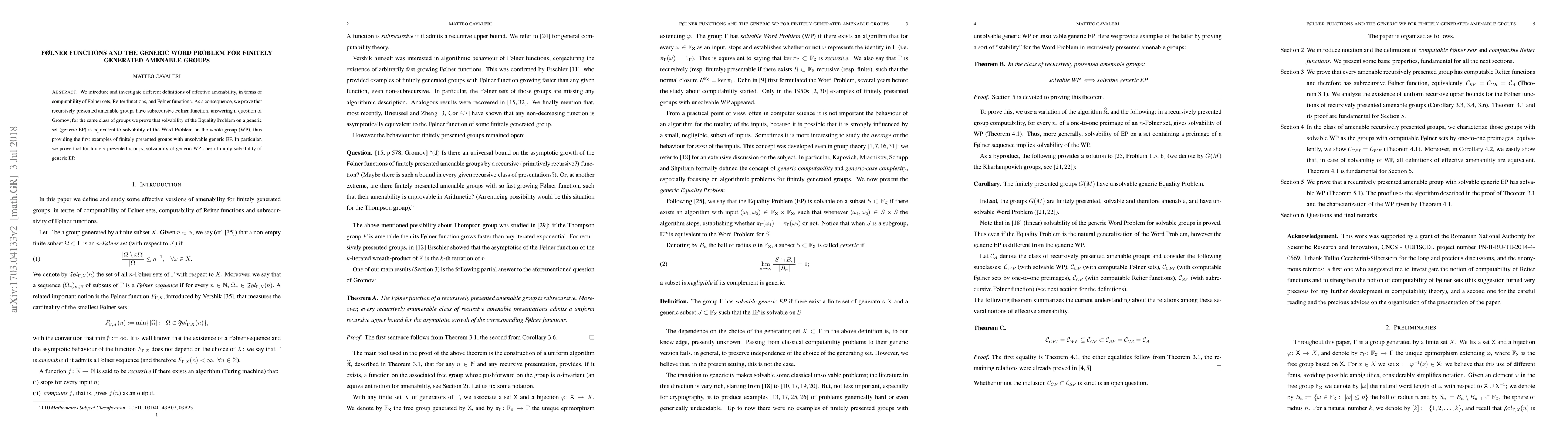 We introduce and investigate different definitions of effective amenability, in terms of computability of F{\o}lner sets, Reiter functions, and F{\o}lner functions. As a consequence, we prove that recursively presented amenable groups have subrecursive F{\o}lner function, answering a question of Gromov, for the same class of groups we prove that solvability of the Equality Problem on a generic set (generic EP) is equivalent to solvability of the Word Problem on the whole group (WP), thus providing the first examples of finitely presented groups with unsolvable generic EP. In particular, we prove that for finitely presented groups, solvability of generic WP doesn't imply solvability of generic EP.