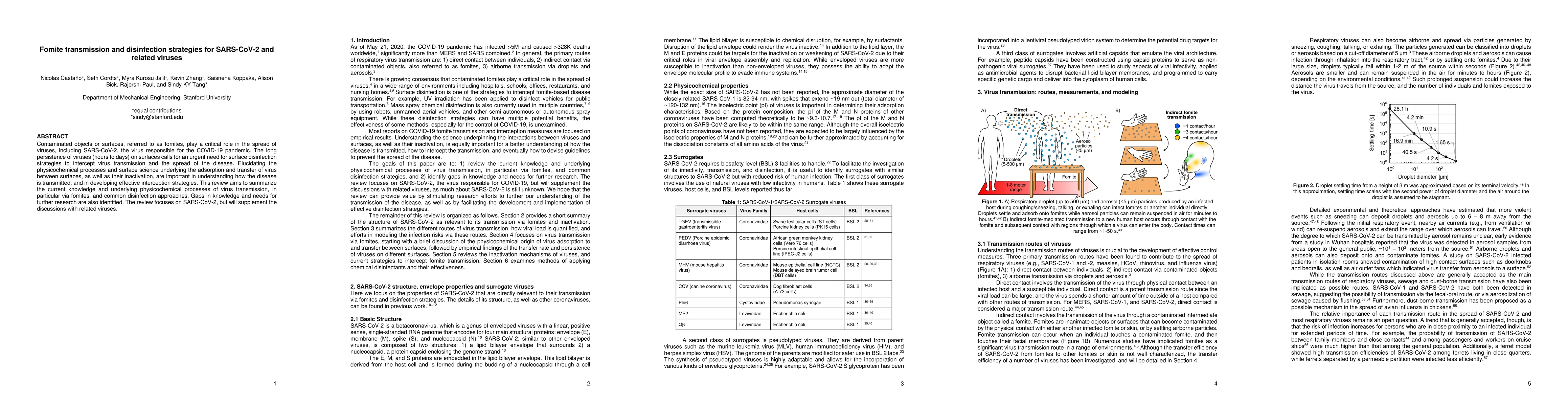 This paper reviews the role of fomites in the transmission of SARS-CoV-2 and related viruses, emphasizing the need for effective surface disinfection strategies. It explores the physicochemical processes underlying virus persistence and transmission, and discusses current disinfection methods, highlighting gaps in knowledge and future research needs.
