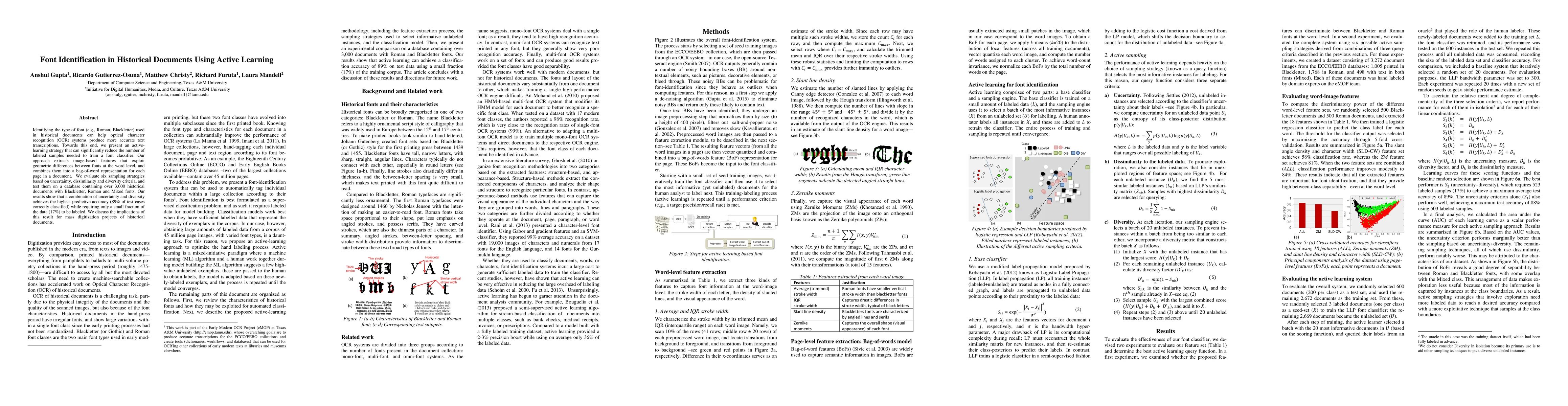 Identifying the type of font (e.g., Roman, Blackletter) used in historical documents can help optical character recognition (OCR) systems produce more accurate text transcriptions. Towards this end, we present an active-learning strategy that can significantly reduce the number of labeled samples needed to train a font classifier. Our approach extracts image-based features that exploit geometric differences between fonts at the word level, and combines them into a bag-of-word representation for each page in a document. We evaluate six sampling strategies based on uncertainty, dissimilarity and diversity criteria, and test them on a database containing over 3,000 historical documents with Blackletter, Roman and Mixed fonts. Our results show that a combination of uncertainty and diversity achieves the highest predictive accuracy (89% of test cases correctly classified) while requiring only a small fraction of the data (17%) to be labeled. We discuss the implications of this result for mass digitization projects of historical documents.