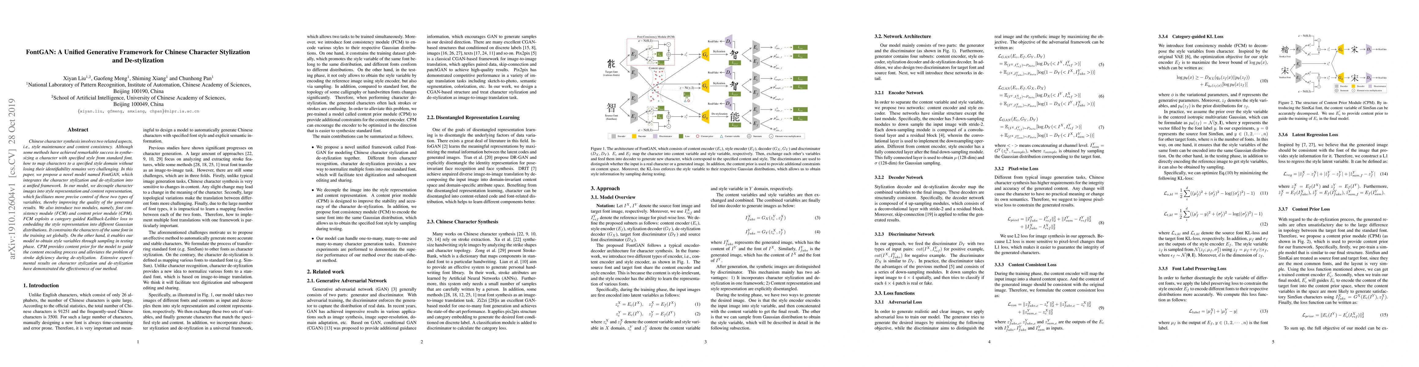 FontGAN presents a unified generative framework for Chinese character stylization and de-stylization by decoupling style and content representations. The model employs a font consistency module and a content prior module to enhance character identifiability and improve the quality of synthesized results.