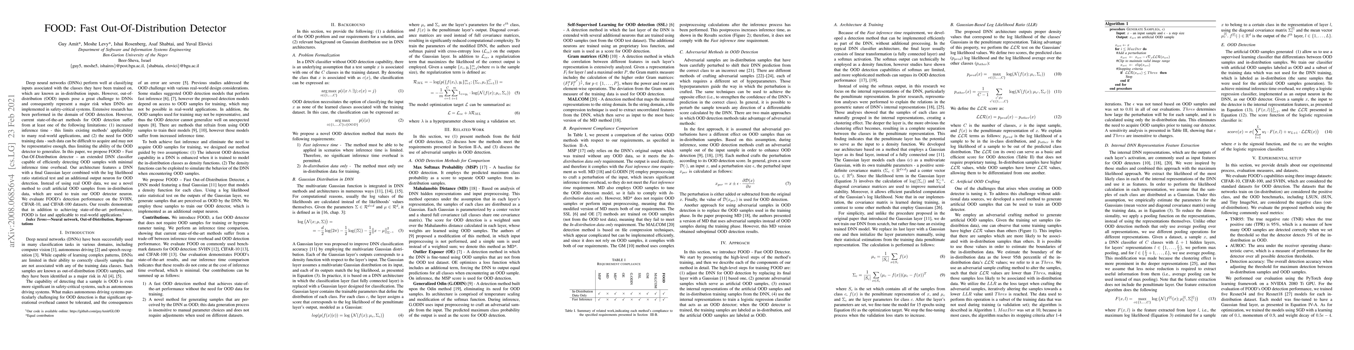 The FOOD (Fast Out-Of-Distribution Detector) proposes an efficient DNN classifier with a Gaussian layer and log likelihood ratio test for detecting OOD samples with minimal inference time. It trains the OOD detector using artificially crafted samples instead of real OOD data, achieving state-of-the-art performance and fast detection suitable for real-world applications.
