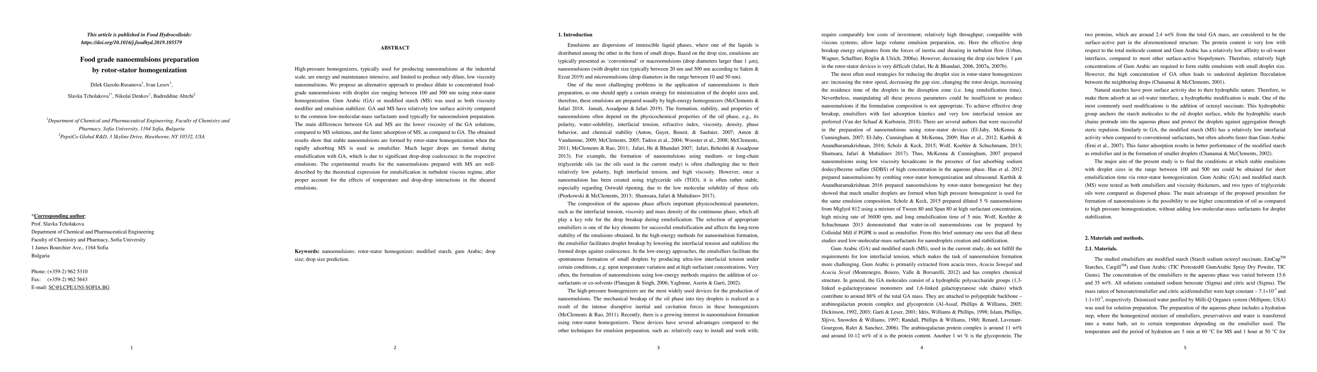 High-pressure homogenizers, typically used for producing nanoemulsions at the industrial scale, are energy and maintenance intensive, and limited to produce only dilute, low viscosity nanoemulsions. We propose an alternative approach to produce dilute to concentrated food-grade nanoemulsions with droplet size ranging between 100 and 500 nm using rotor-stator homogenization. Gum Arabic (GA) or modified starch (MS) was used as both viscosity modifier and emulsion stabilizer. GA and MS have relatively low surface activity compared to the common low-molecular-mass surfactants used typically for nanoemulsion preparation. The main differences between GA and MS are the lower viscosity of the GA solutions, compared to MS solutions, and the faster adsorption of MS, as compared to GA. The obtained results show that stable nanoemulsions are formed by rotor-stator homogenization when the rapidly adsorbing MS is used as emulsifier. Much larger drops are formed during emulsification with GA, which is due to significant drop-drop coalescence in the respective emulsions. The experimental results for the nanoemulsions prepared with MS are well-described by the theoretical expression for emulsification in turbulent viscous regime, after proper account for the effects of temperature and drop-drop interactions in the sheared emulsions.