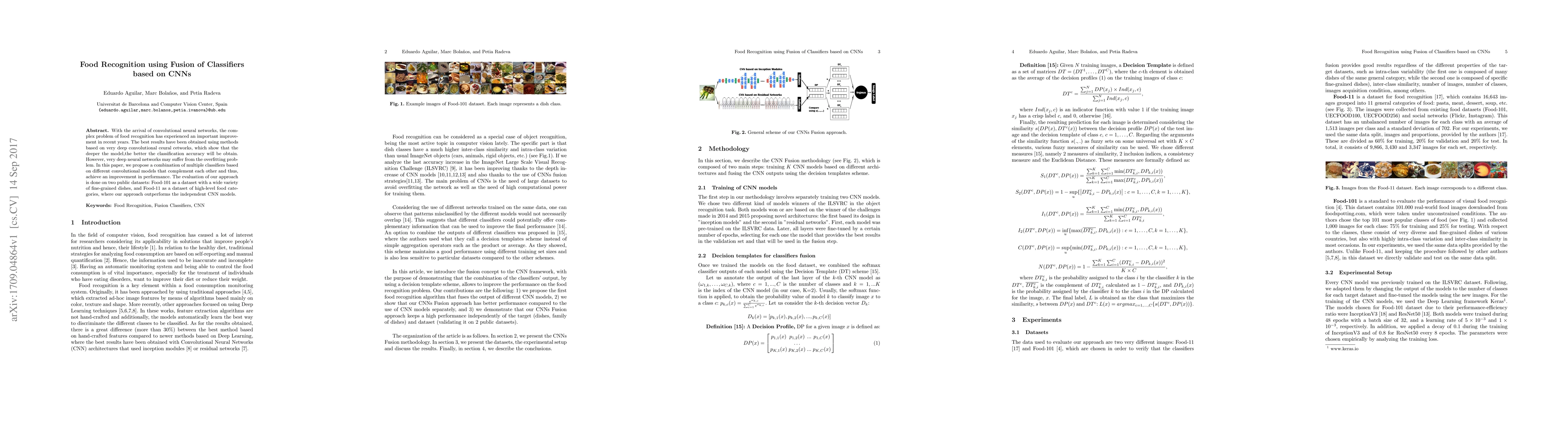 With the arrival of convolutional neural networks, the complex problem of food recognition has experienced an important improvement in recent years. The best results have been obtained using methods based on very deep convolutional neural networks, which show that the deeper the model,the better the classification accuracy will be obtain. However, very deep neural networks may suffer from the overfitting problem. In this paper, we propose a combination of multiple classifiers based on different convolutional models that complement each other and thus, achieve an improvement in performance. The evaluation of our approach is done on two public datasets: Food-101 as a dataset with a wide variety of fine-grained dishes, and Food-11 as a dataset of high-level food categories, where our approach outperforms the independent CNN models.