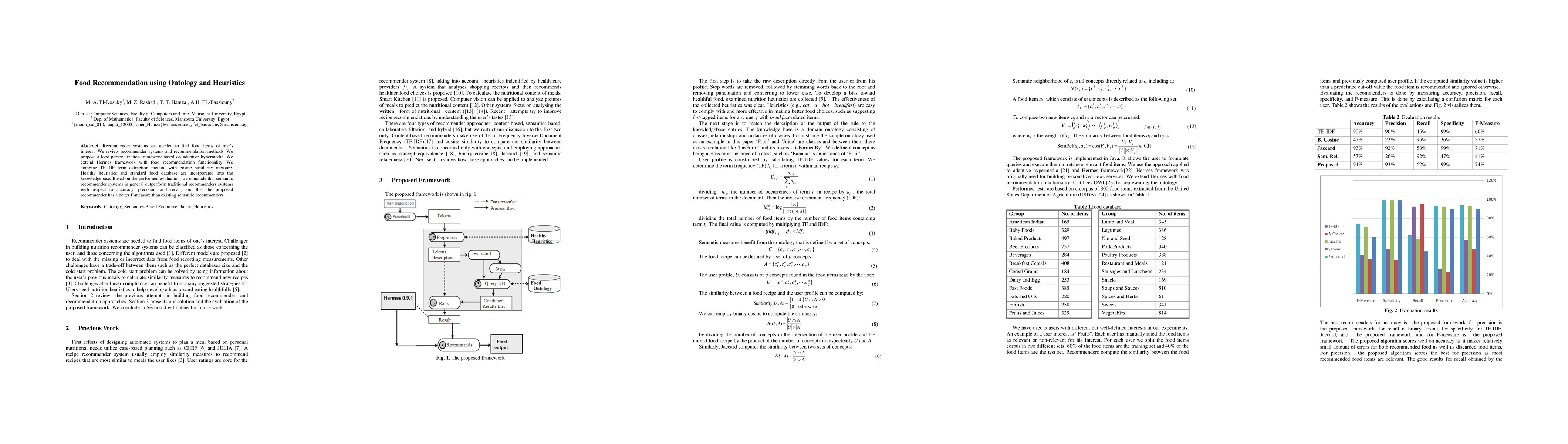 This paper proposes a food recommendation framework using ontology and heuristics, extending the Hermes adaptive hypermedia framework with a TF-IDF term extraction method and cosine similarity measure. The evaluation shows that the proposed semantic recommender system outperforms traditional systems in terms of accuracy, precision, recall, and F-measure.