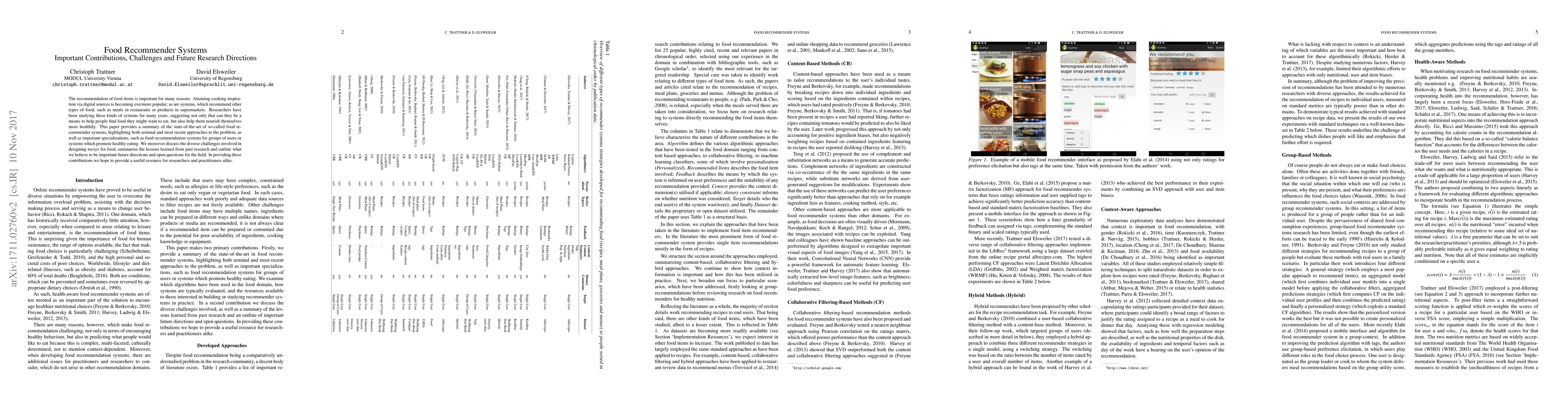 The recommendation of food items is important for many reasons. Attaining cooking inspiration via digital sources is becoming evermore popular; as are systems, which recommend other types of food, such as meals in restaurants or products in supermarkets. Researchers have been studying these kinds of systems for many years, suggesting not only that can they be a means to help people find food they might want to eat, but also help them nourish themselves more healthily. This paper provides a summary of the state-of-the-art of so-called food recommender systems, highlighting both seminal and most recent approaches to the problem, as well as important specializations, such as food recommendation systems for groups of users or systems which promote healthy eating. We moreover discuss the diverse challenges involved in designing recsys for food, summarise the lessons learned from past research and outline what we believe to be important future directions and open questions for the field. In providing these contributions we hope to provide a useful resource for researchers and practitioners alike.