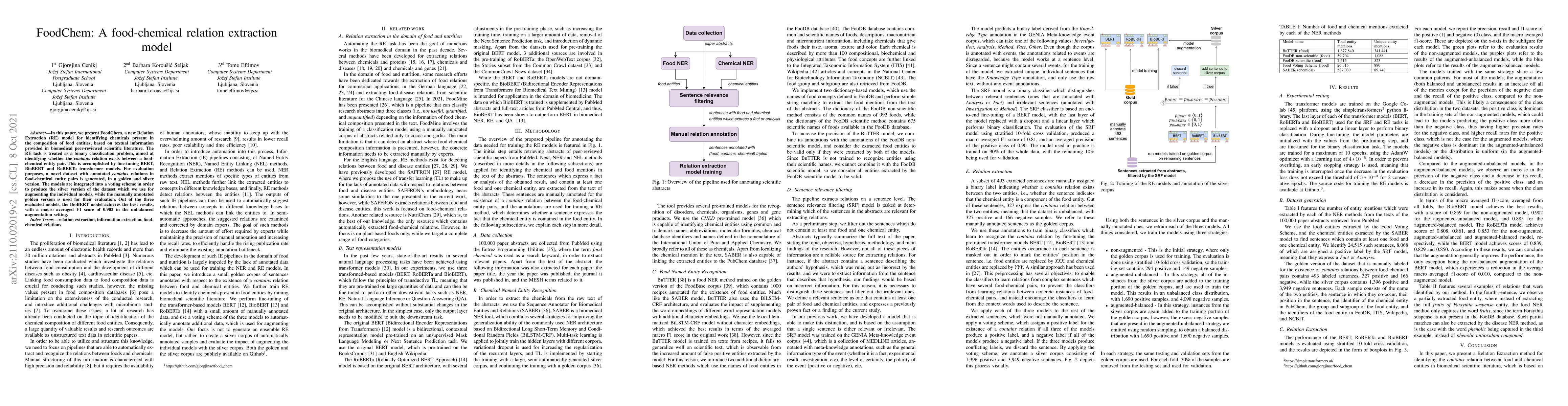 In this paper, we present FoodChem, a new Relation Extraction (RE) model for identifying chemicals present in the composition of food entities, based on textual information provided in biomedical peer-reviewed scientific literature. The RE task is treated as a binary classification problem, aimed at identifying whether the contains relation exists between a food-chemical entity pair. This is accomplished by fine-tuning BERT, BioBERT and RoBERTa transformer models. For evaluation purposes, a novel dataset with annotated contains relations in food-chemical entity pairs is generated, in a golden and silver version. The models are integrated into a voting scheme in order to produce the silver version of the dataset which we use for augmenting the individual models, while the manually annotated golden version is used for their evaluation. Out of the three evaluated models, the BioBERT model achieves the best results, with a macro averaged F1 score of 0.902 in the unbalanced augmentation setting.