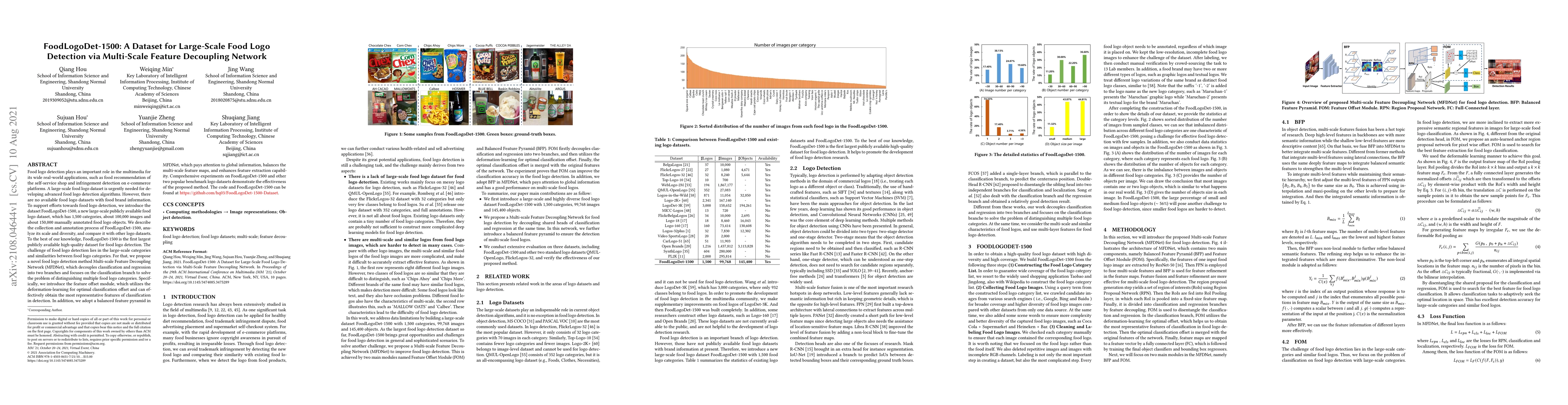 The paper introduces FoodLogoDet-1500, a large-scale food logo dataset with 1,500 categories and 150,000 annotated objects, aimed at advancing food logo detection algorithms. The authors propose a Multi-scale Feature Decoupling Network (MFDNet) to tackle the challenge of distinguishing similar food logos, demonstrating its effectiveness through comprehensive experiments.